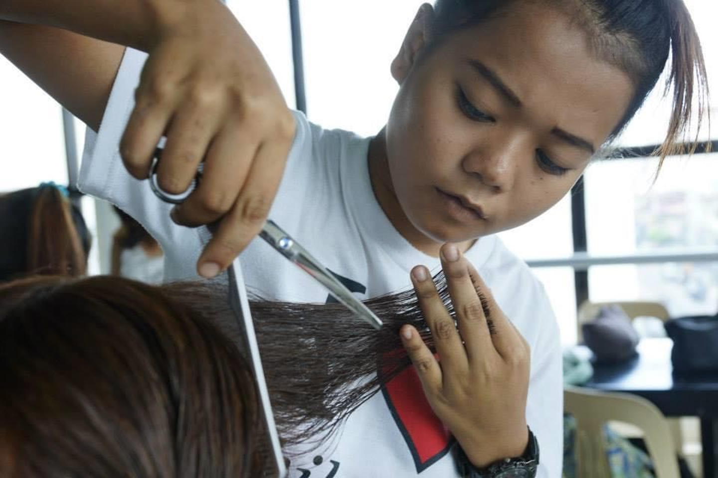 新スタジオの目玉となる「ハサミノチカラ新アカデミー」は、マニラの教育省や自治体と提携し、1年間の講座を通して17歳以上の青年達の自立を支援する本格的なアカデミー。従来のカット技術講習に加え、カラー・ヘッドスパ・トリートメント・縮毛矯正といった“カットだけではない技術”を身に付け就業に結び付けてもらうべく、新カリキュラムを編成しています。