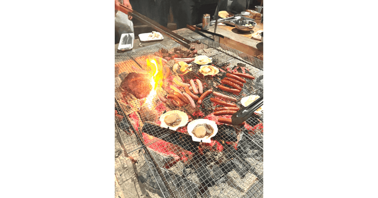 かまどや炭焼のセットがバッチリ揃っている屋外の食事会場で、豪華食材を調理していきます。美味しいお酒に、美味しいごはん、すてきな仲間。幸せな空間です。