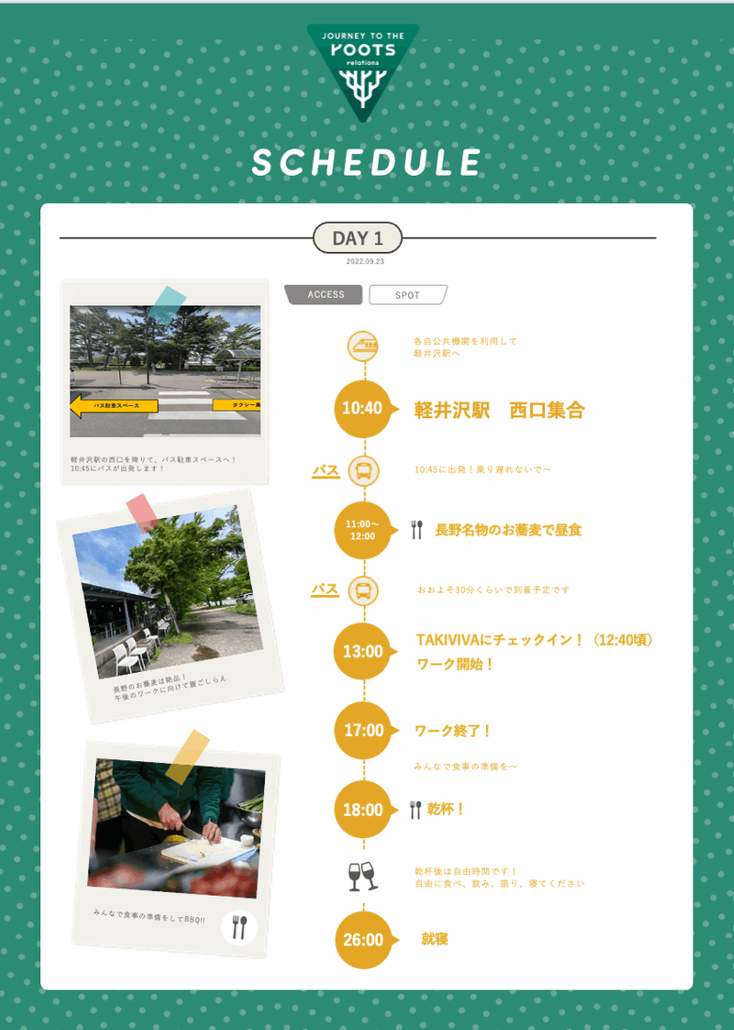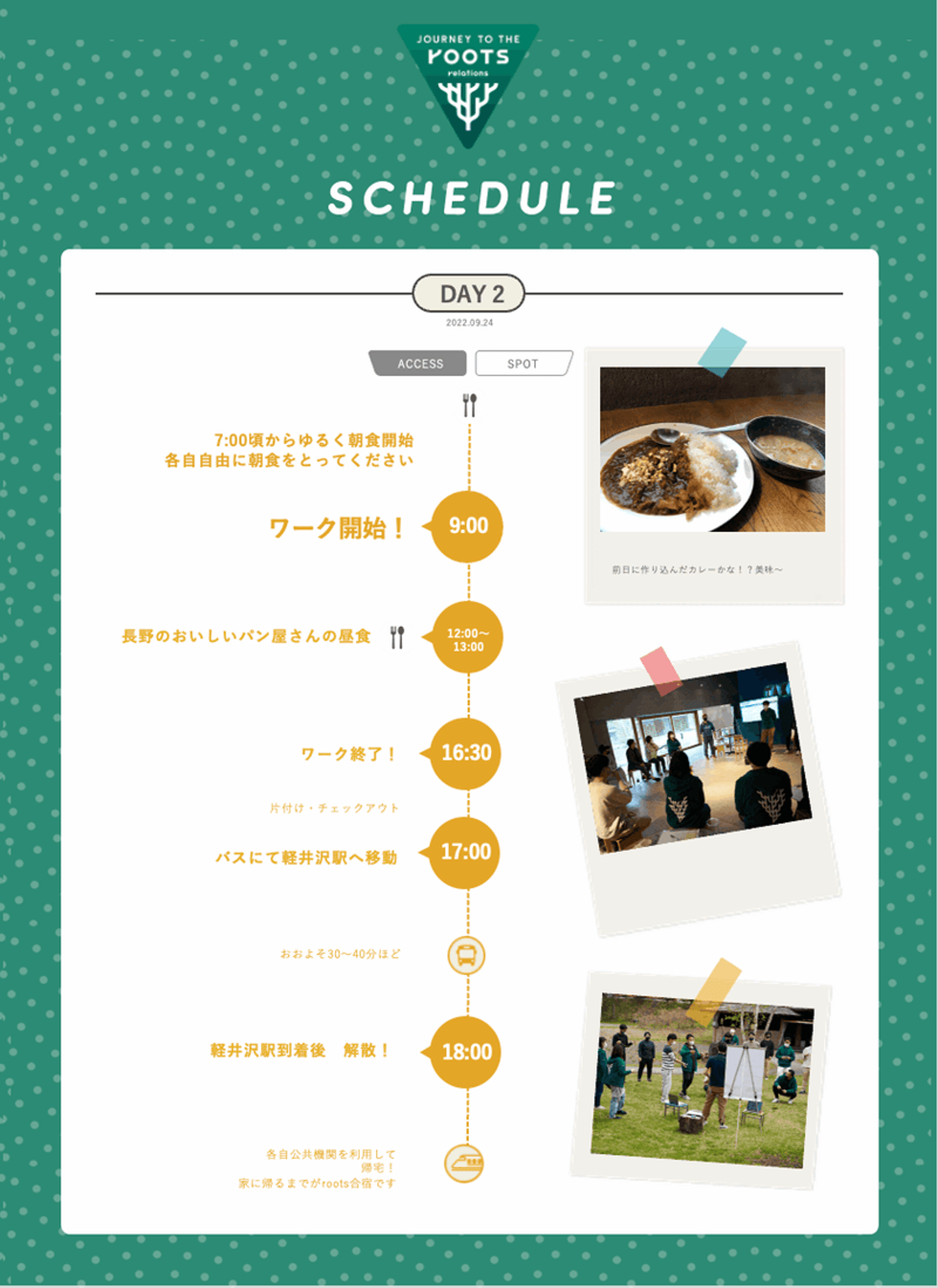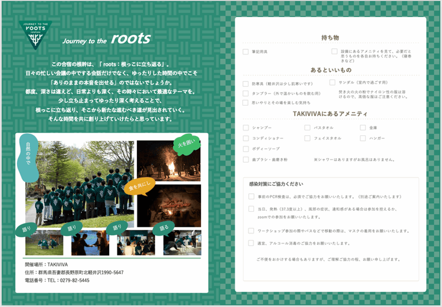 ちなみに、事前に配布された「合宿のしおり(JOURNEY TO THE ROOTS)」がこちら↓