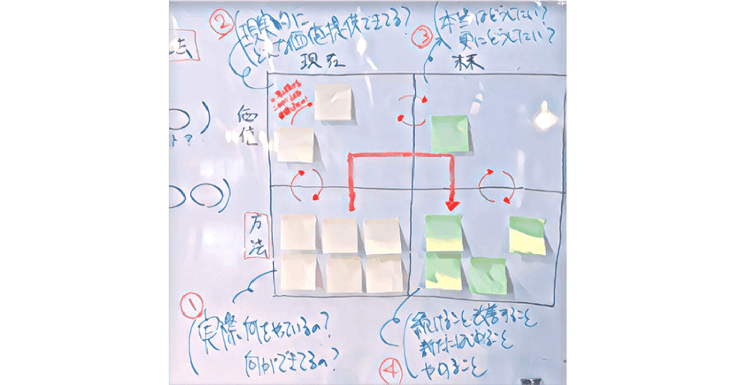 昨日の流れをふまえて、事業面にフォーカスした対話になるよう、顧客視点から見る現状の価値→未来の価値を中心とした枠組みで、対話を重ねていきました。