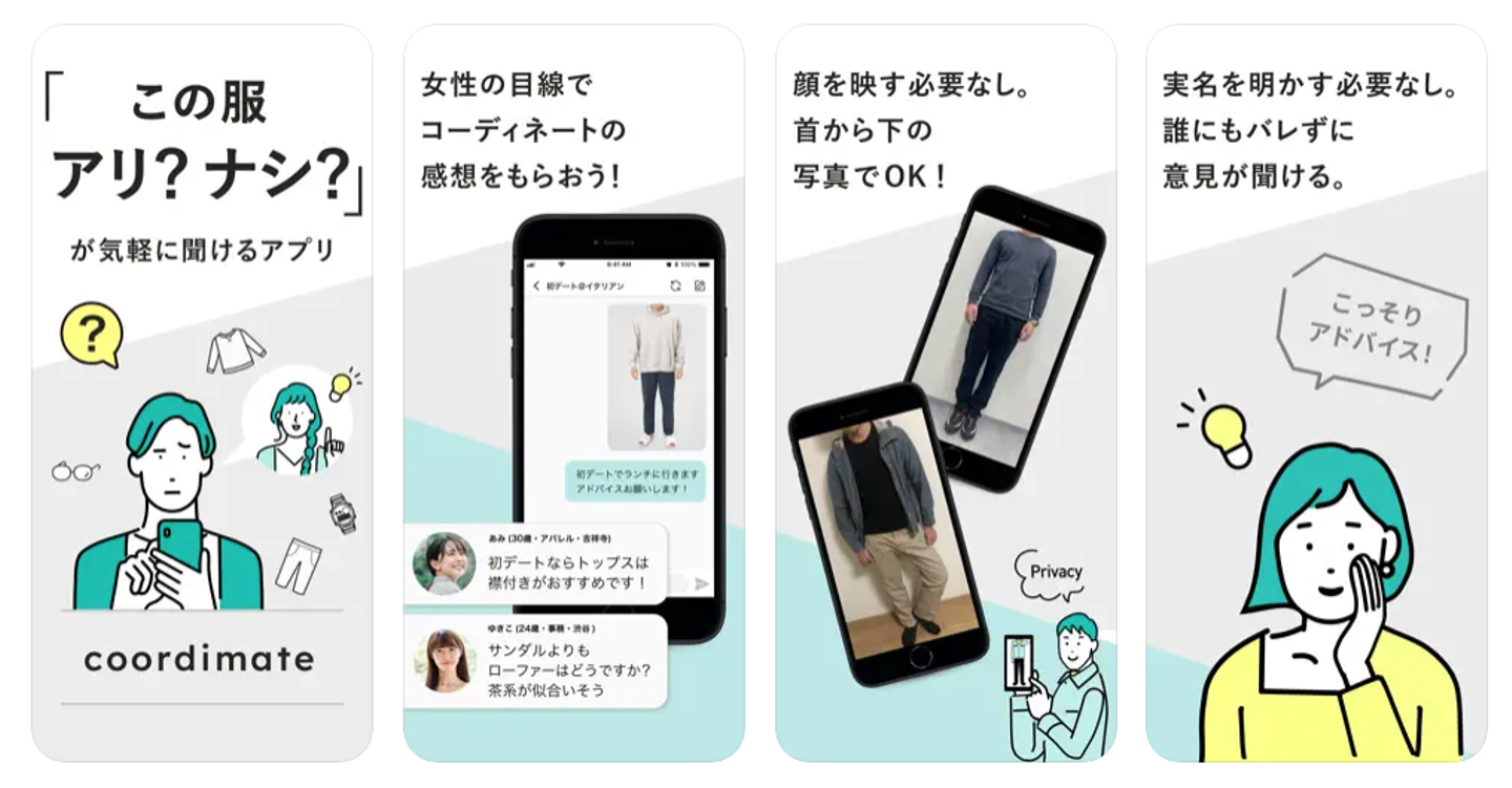 女性なら、誰しもが「デート時の男性の服装にガッカリした経験」があるかもしれません。このアプリはそんな課題を解決するサービスで、ファッションにアドバイスを求めたい男性が、「このコーディネートは女性の目から見てどうか」をmateと呼ばれる女性会員に意見を求められるサービスです。