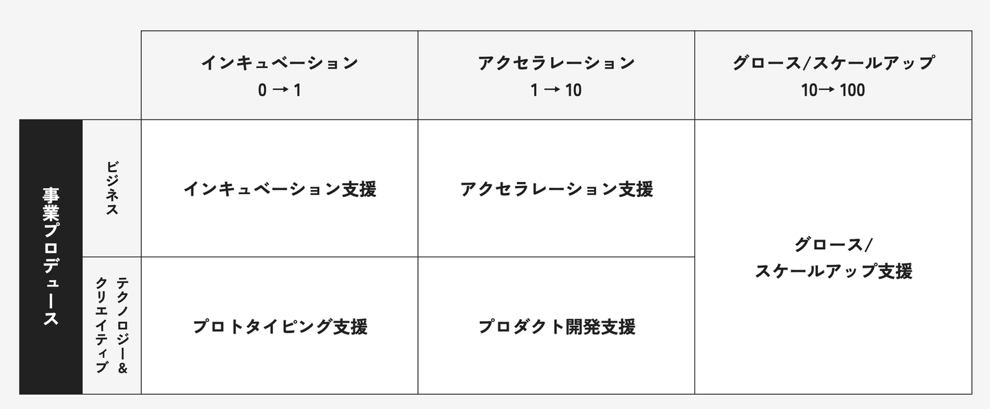 対して、新規事業立ち上げの実務、つまり事業の骨子が決まっていて、プロトタイプを用いて受容性の検証をしたり、実際にビジネスとしてサービス立ち上げやグロースを推進する事業支援を、ビジネスクリエイション事業部が担当します。