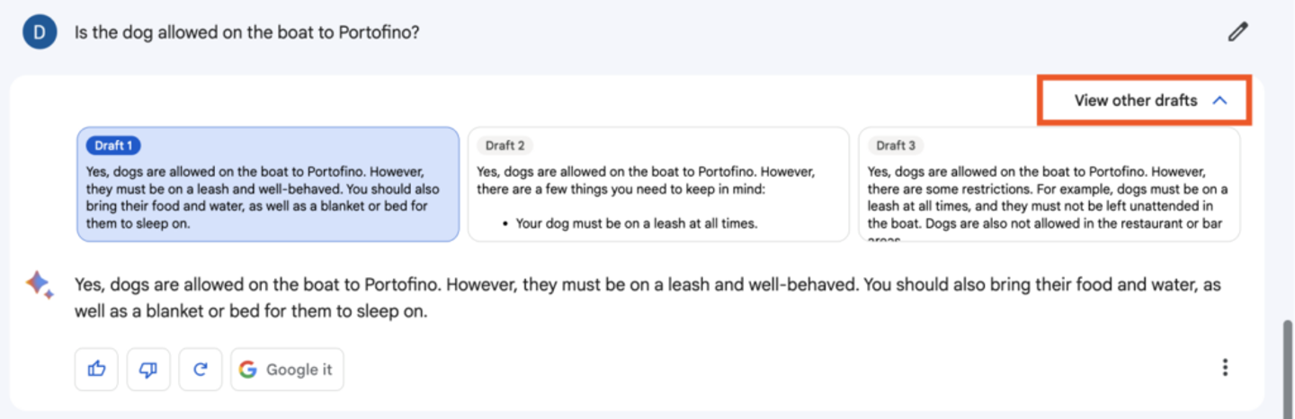 また、すべての応答には「Google it」という CTA が付いているので、ソースを確認できます。