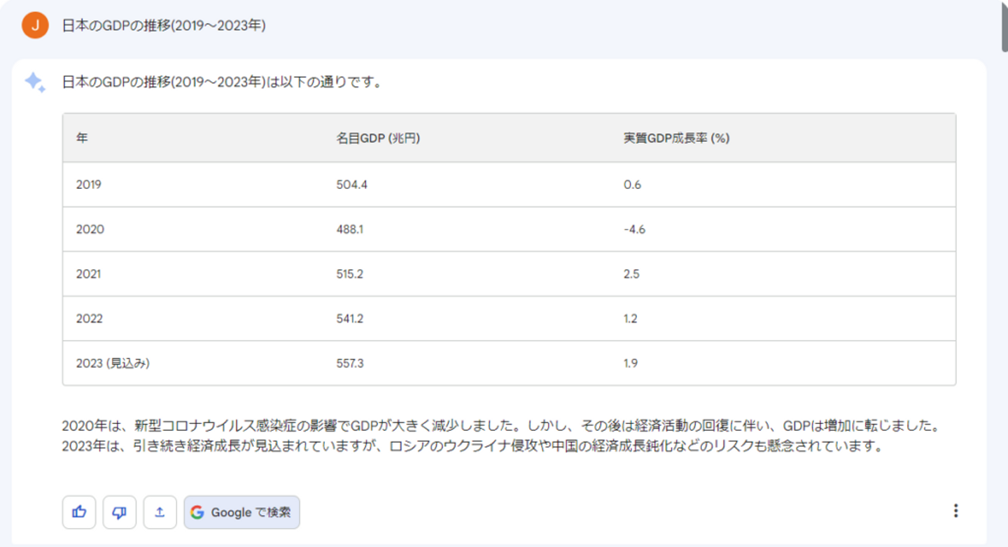 しかし、世界経済ネタ帳と内閣府のデータによって、GPTとBardの精度と適性が低いです。両方は間違いデータを提供します。それは、AIのデメリットです。それで、AIを使うとき引用ソースをもう一度チェックしなければなりません。
