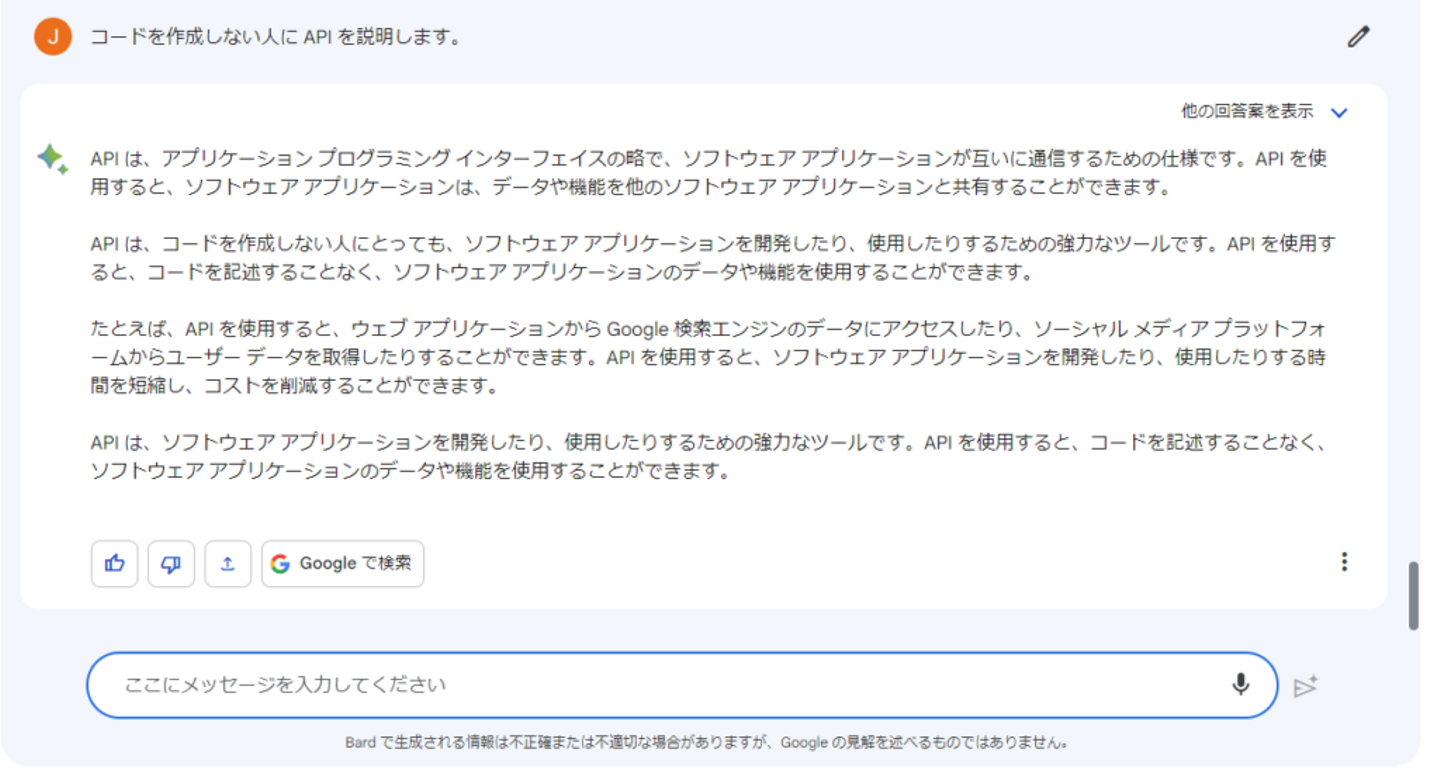 どちらの説明も明確で理解しやすいですが、ChatGPTの回答では、ソフトウェア開発で API がどのように利用されるかについてより詳細な説明が提供されています。