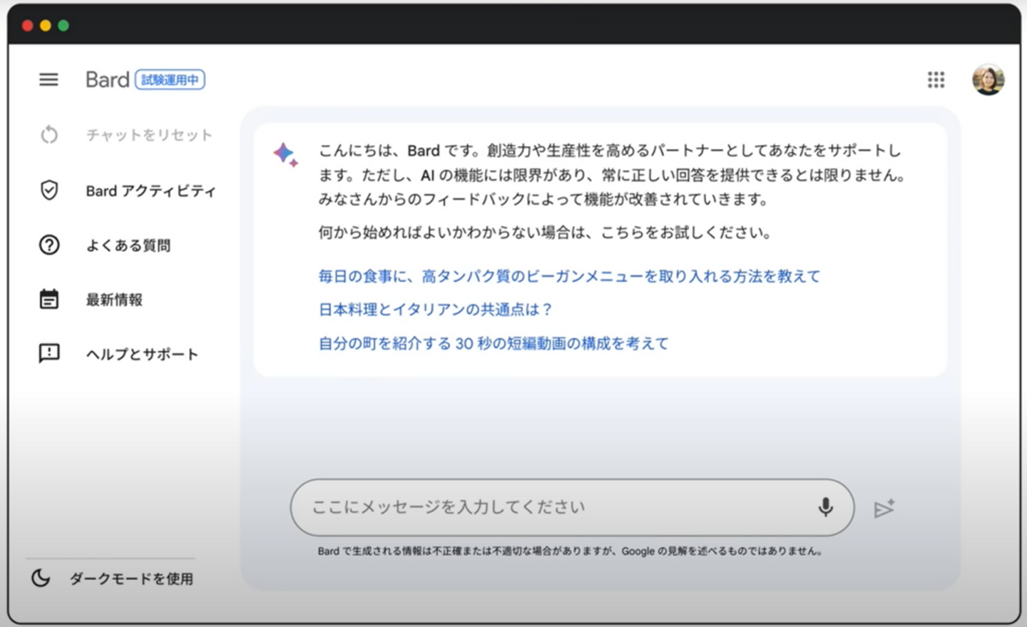 Google Bard を利用するには、bard.google.com にアクセスします。Google の他の製品と同様に、Googleアカウントでログインする必要があります。また、利用規約に同意する必要がありますが、すぐに Google Bard を使い始めることができます。ChatGPTと同様、Bardもほとんどが空のテキストフィールドで、”ここにメッセージを入力してください “と表示されます。プロンプトや質問を入力すると、Bardが答えを提示してくれます。