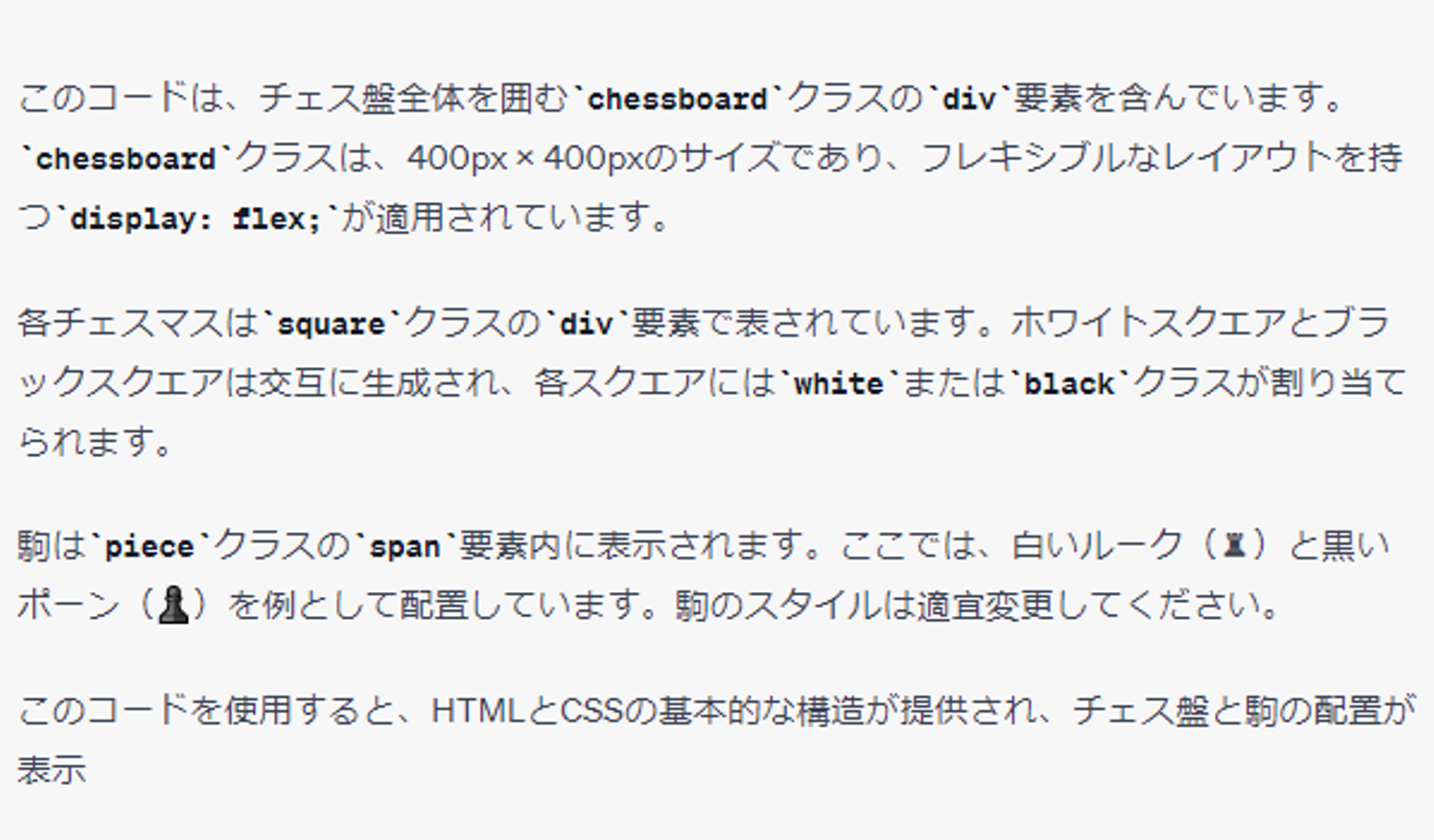 ChatGPT 4 によって生成された HTML および CSS コードは、開始位置に配置された駒を備えたチェス盤を正確に表しています。さらに、このコードには各チェスの駒の CSS クラスが含まれており、駒を表す画像の使用を示しています。この応答は、チェス ゲーム アプリを開発するための強力な基盤となります。