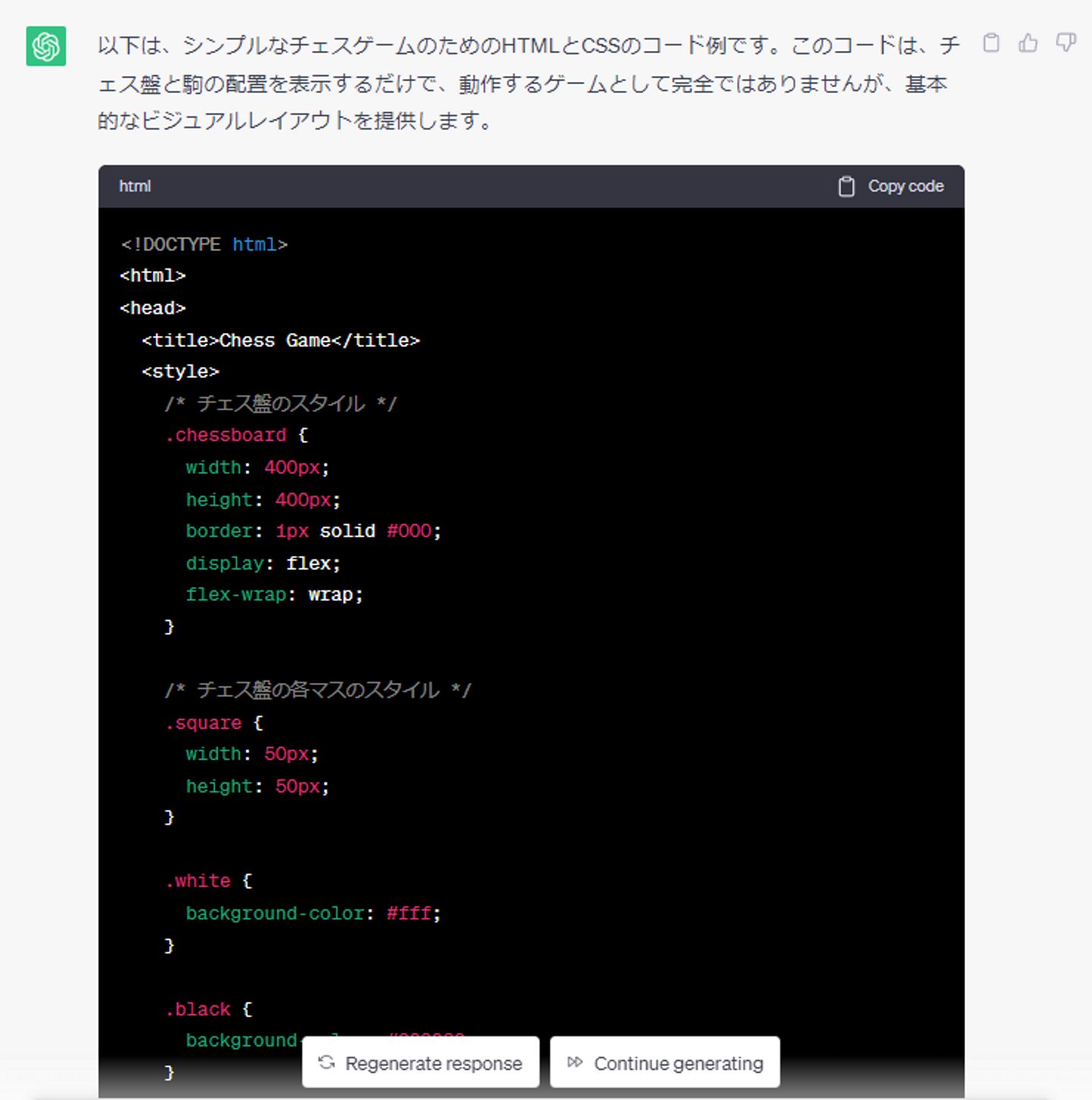 彼らにコーディングを促すと、ChatGPT 4 の答えは、チェス ゲーム アプリのレイアウトを作成するためのより完全なソリューションを提供します。