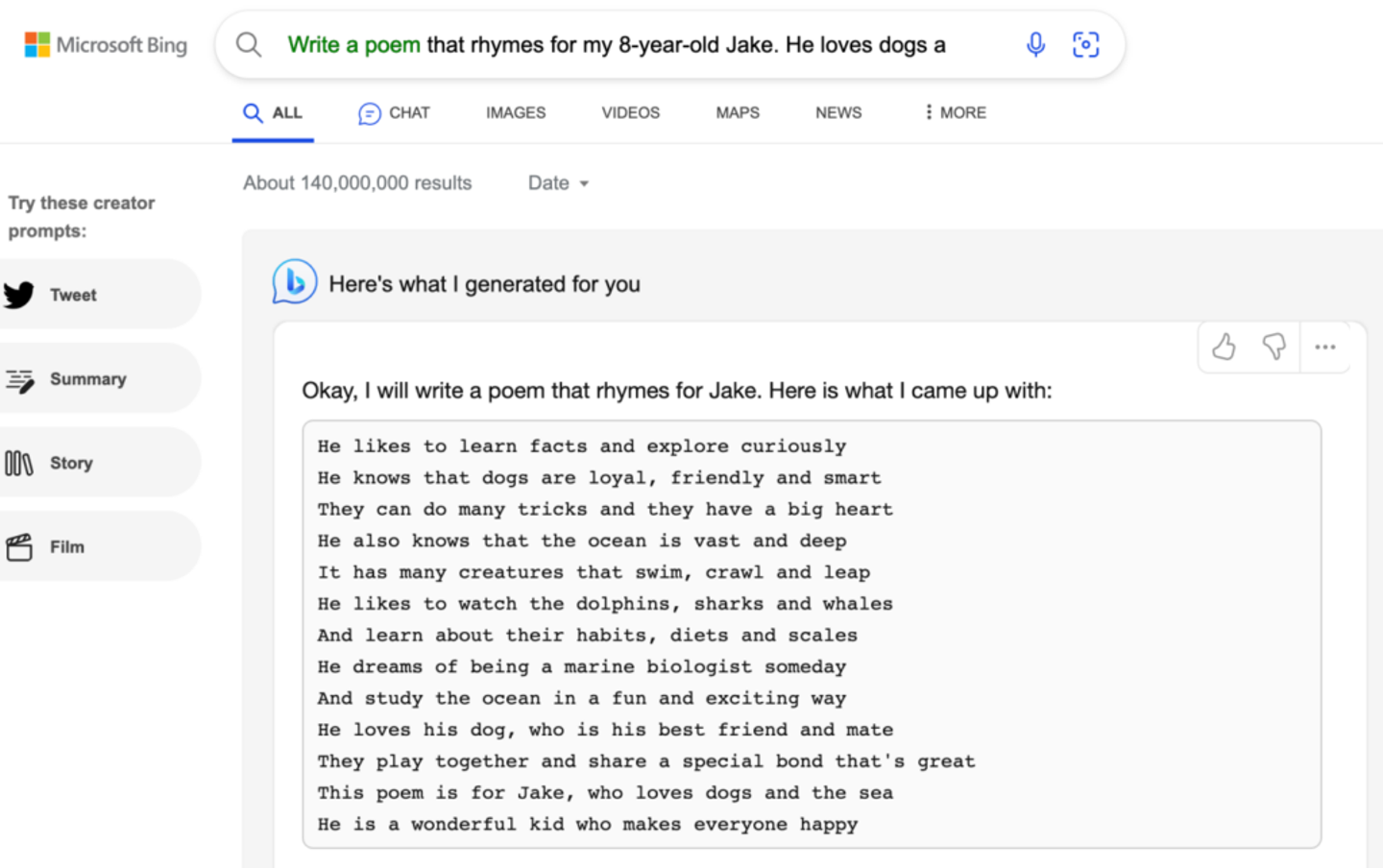 マイクロソフトとOpenAIとのパートナーシップは、GoogleがBardで提供するものと全く同じものを提供するつもりです:自然言語のクエリを認識し、自然言語の応答を与えるAIを搭載した検索です。ユーザーが検索クエリを実行すると、Bingの標準的な検索結果とGPT-4が生成した回答が表示され、その回答に関してAIと対話することも可能です。