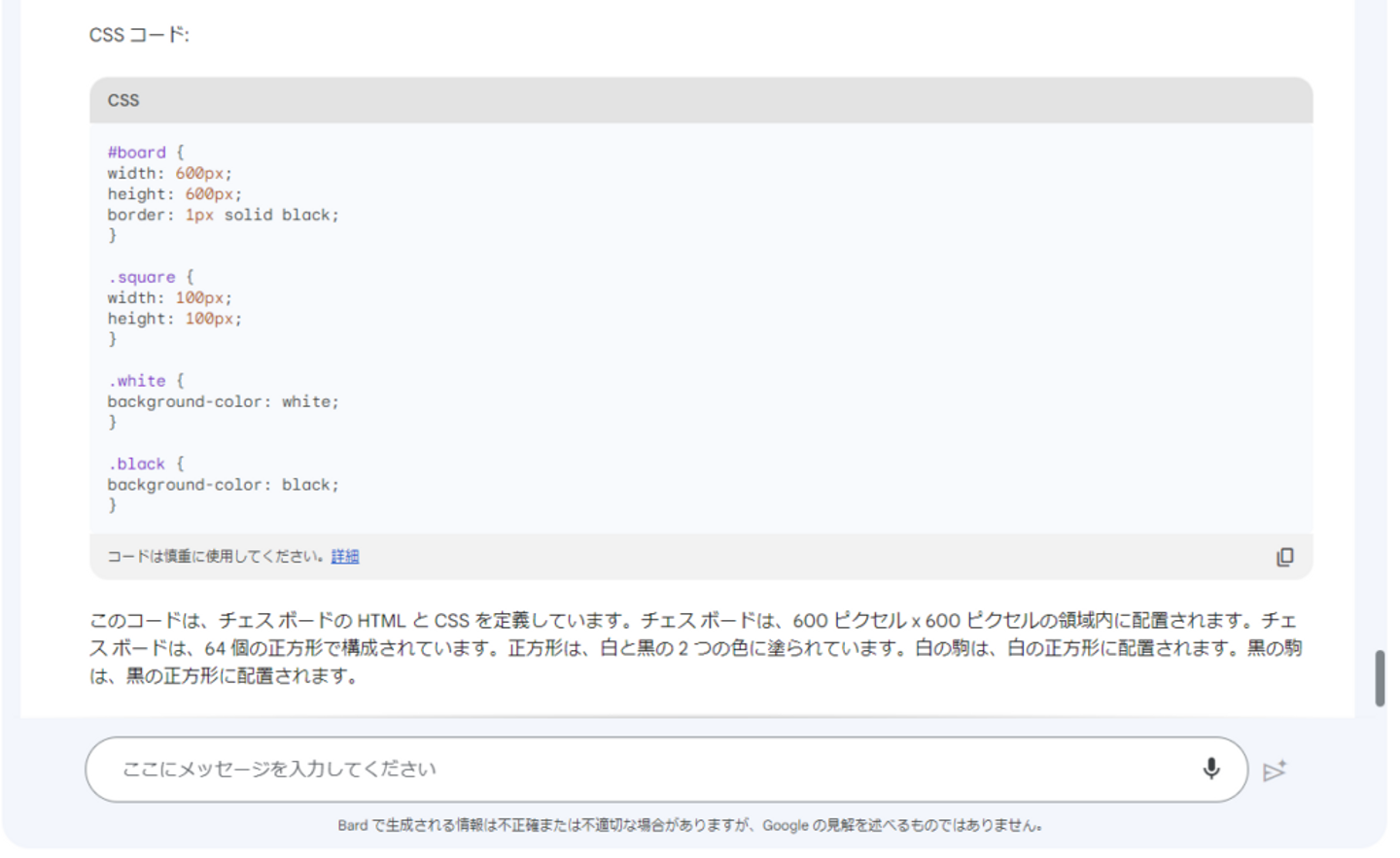 対照的に、Google BARD の返信は、駒のない基本的な 8×8 チェス盤のHTMLとCSSを提示しているだけです。チェス盤のレイアウトは確立されていますが、完全に機能するチェス ゲーム アプリを作成するために必要な重要な詳細を提供するには至っていません。