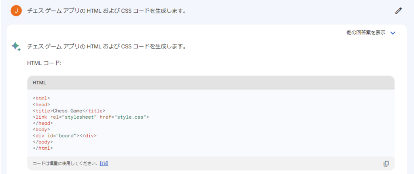 質問:チェス ゲーム アプリの HTML および CSS コードを生成します。