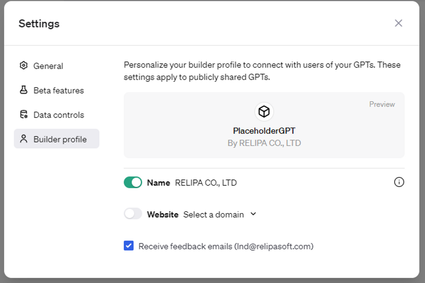- 5. 開発者のプロファイルを確認します (Setting [設定] → 開発者のプロファイル[ビルダー プロファイル] → [自分の名前または検証済み Web サイトを有効にする] に移動します)。