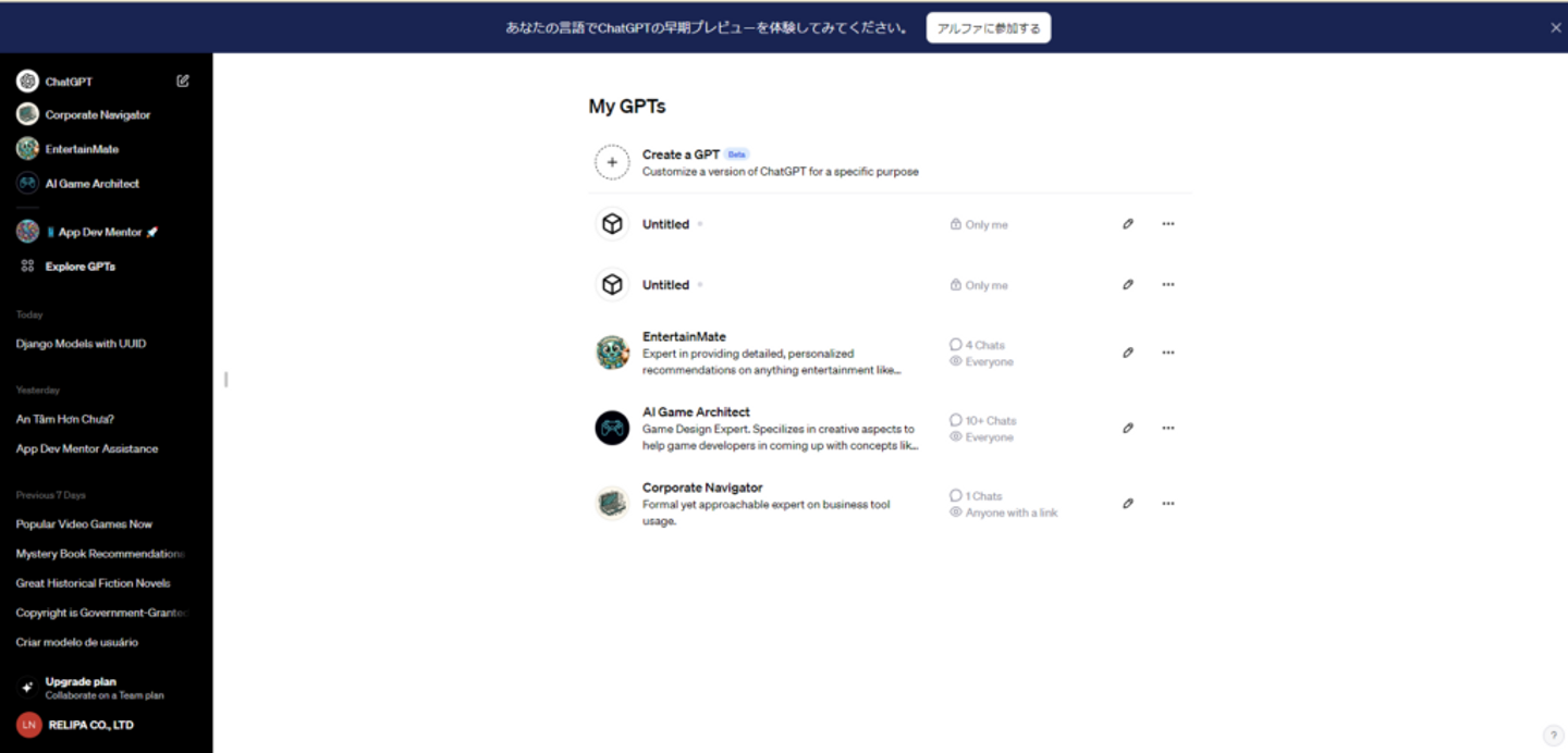 革新的なGPTストアリリースを体験しましょう!レリパは、ユーザーの様々なニーズに対応するために細心の注意を払って設計された3つの最先端のチャットボットを導入し、比類のないパーソナライズされた対話を保証します。これらのチャットボットは、ユーザーがAIテクノロジーの最新の進歩に取り組む方法を再定義することで、イノベーションと機能性が融合する世界に足を踏み入れましょう。ぜひ参加して、RELIPAのチャットボットの革新的な機能を探索してください。