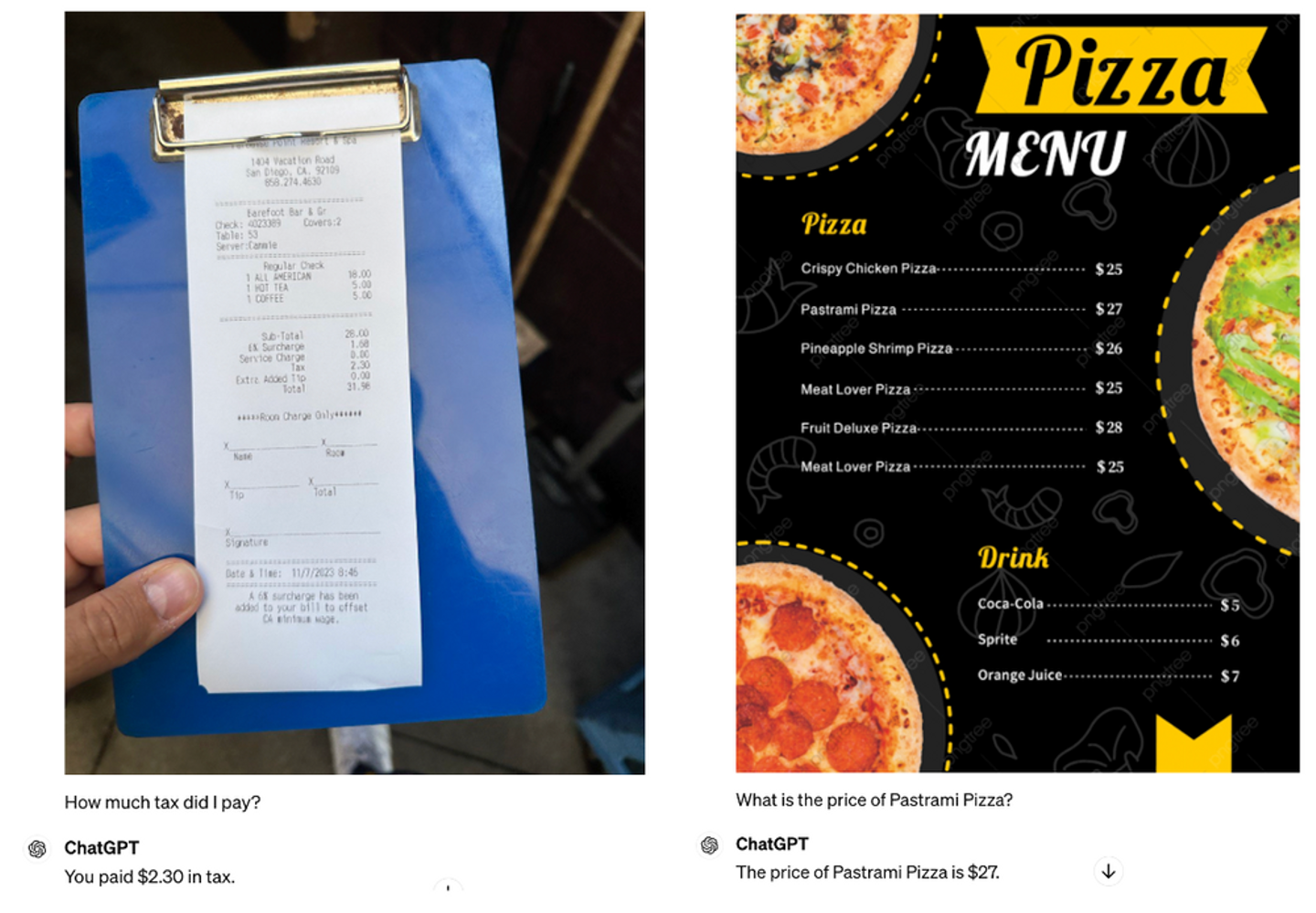 たとえば、GPT-4oが文字がたくさん書かれた画像から重要な情報を抽出する能力を評価します。レシートを見せて「私はいくら税金を払いましたか?」と尋ねたり、ピザメニューを見せて「パストラミピザの値段はいくらですか?」と尋ねたりすると、GPT-4oはどちらの質問にも正しく答えます。