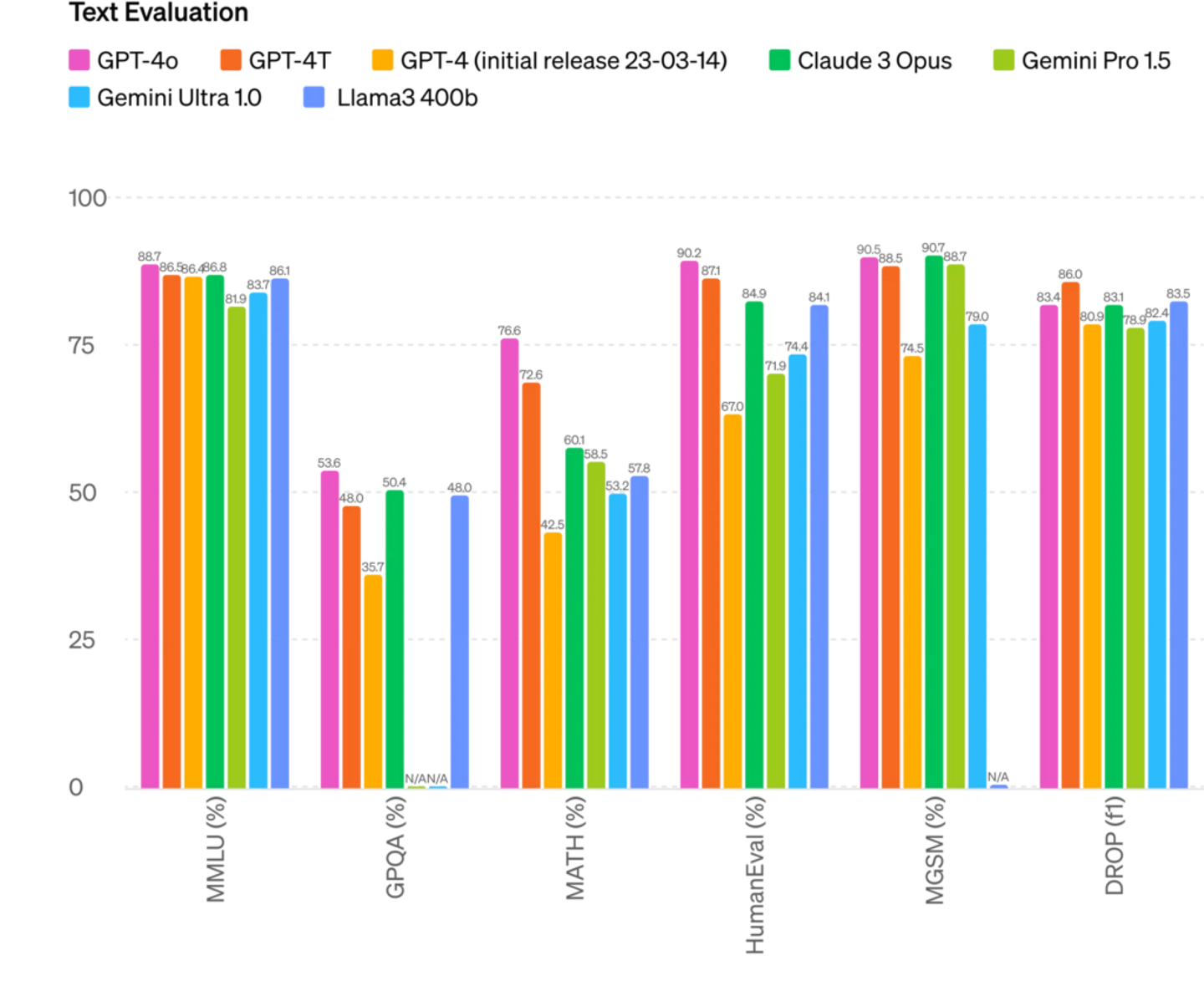 OpenAIが独自に発表したベンチマーク結果によると、GPT-4oは以前のGPT-4、AnthropicのClaude 3 Opus、GoogleのGemini、MetaのLlama3と比較して、テキストに関しては若干改善したか、同等のスコアを示しています。