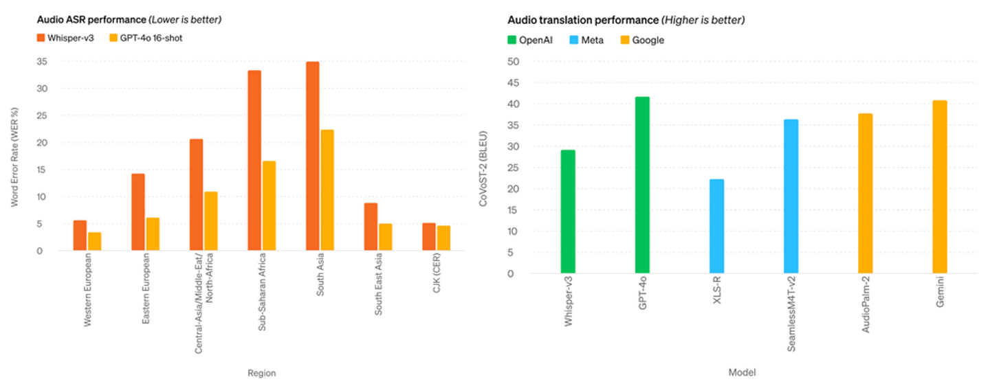 公表されたベンチマークによると、GPT-4oはOpenAI独自の最先端の自動音声認識(ASR)モデルであるWhisper-v3を超え、さらにMetaやGoogleの他の音声翻訳モデルよりも優れているとされています。