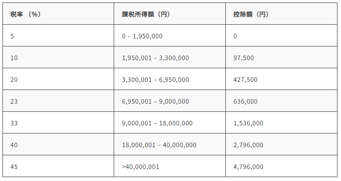 所得税率は所得の区分によって異なり、暗号通貨の利益に対する最大税率は55%ですが、実際にはそれよりも低い税額を支払うことが多いです。以下に具体例を示します。