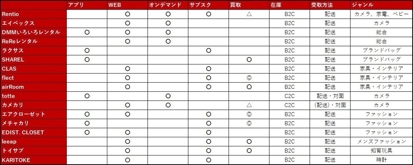 モノのシェアの場合いくつか大きな違いがありまして、まずはアプリかWEBか。次にオンデマンド型なのかサブスク型なのか。買取が可能なのか、できないのか。B2C型なのかC2C型なのか(RentioやtotteさんはB2B2Cもやってますが表では割愛しました)。これだけでかなり違いますし、サービスの特色が良く表れています。