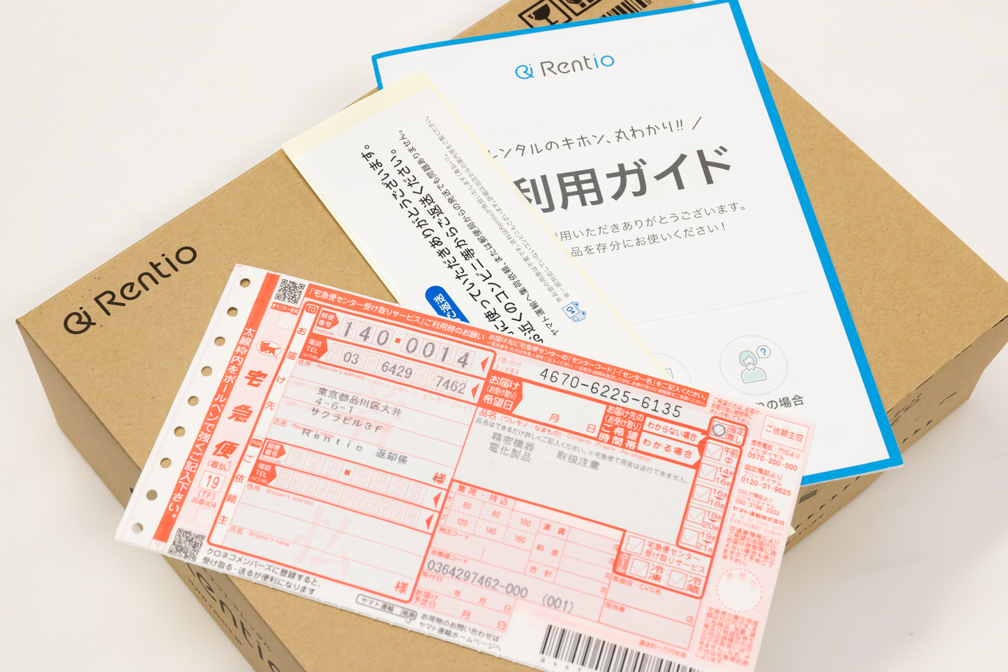 通常カメラなどの家電製品はケーブルやバッテリーなど数多くの付属品がセットになっています。Rentioでは返却漏れ予防のため、商品ごとに付属品の一覧を紙に印刷して同封しています。