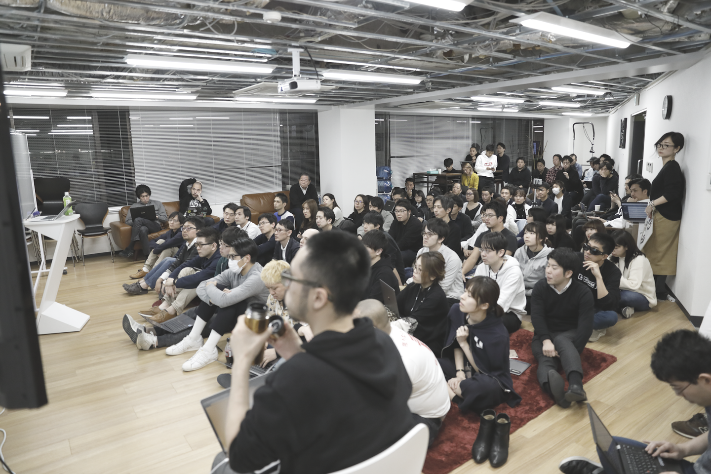 多い月には10名(!!)入社するという勢いでメンバーが急増しているRepro。一方でイベントスペースの収容人数は60名が限界…ということで、今回に限り地べたスタイルで強行突破!