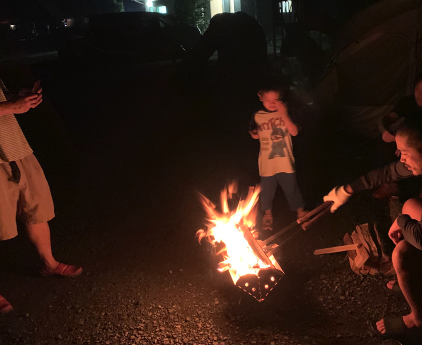 清水:丸太に切り込みを入れて、直接火を付ける焚き火なんですが、すごくおしゃれだし便利なんですよ。見た目も雰囲気が出るし、お鍋などを乗せることもできるので、機材がなくても簡単にお湯を沸かしたり料理が作れるんです。