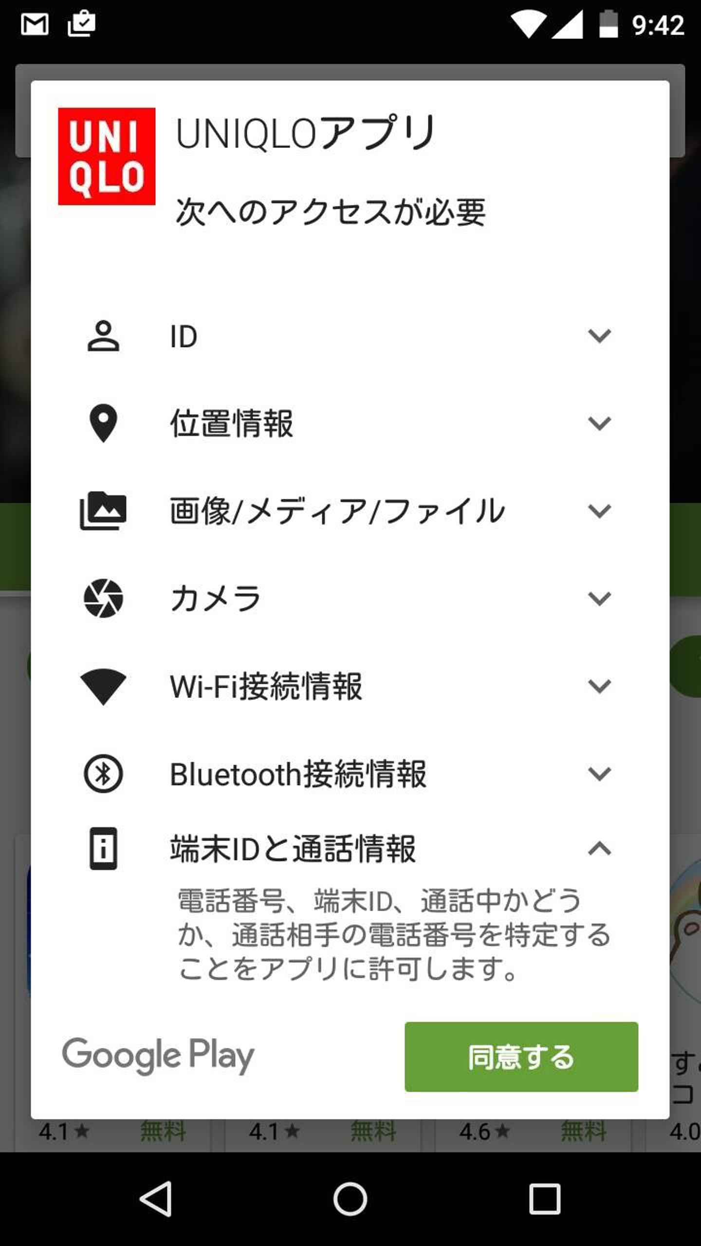 ①Androidではアプリのダウンロードしようとしたら、このような表示がされました。ここで聞かれている項目に「プッシュ通知」とは名言されていませんが、これに同意する=プッシュ通知許諾ということみたいですね。私だったらこれにプッシュ通知が含まれているとは気づかないですね〜。
