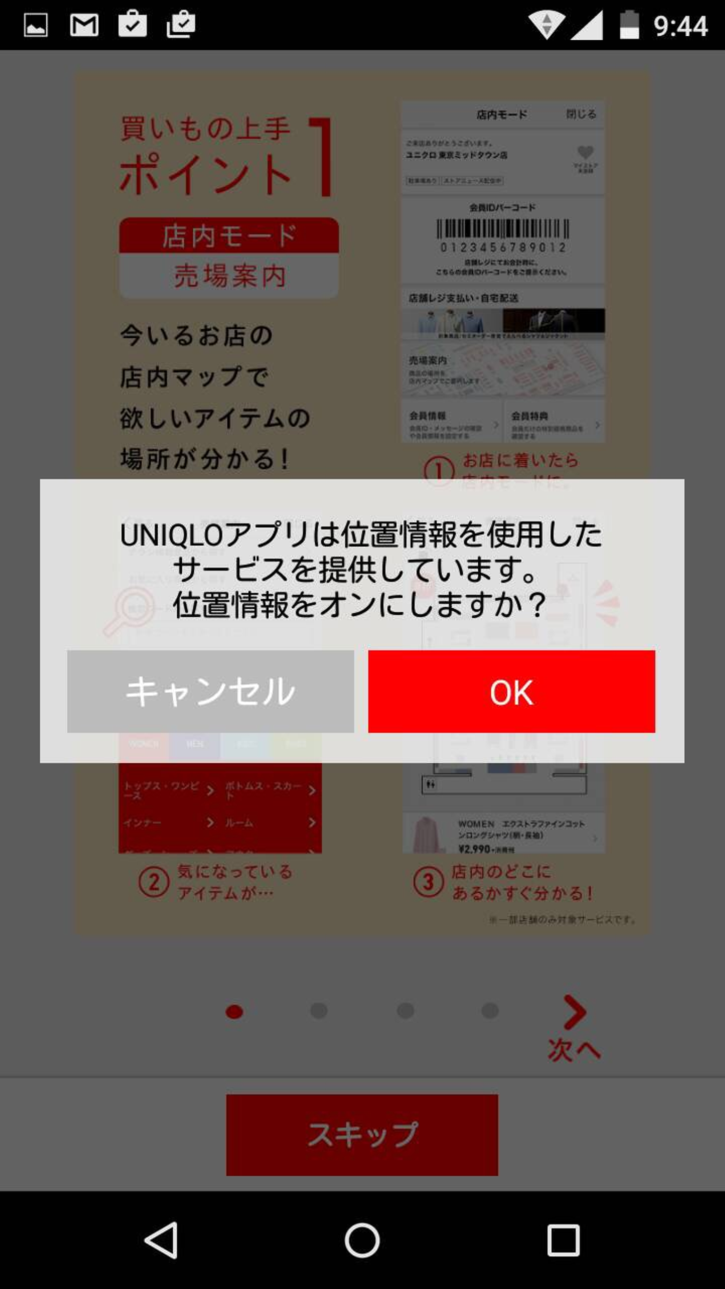 ②そしてアプリの初回起動時に位置情報サービスをオンにするかどうか聞かれました。これはiOSでは聞かれませんでしたね。