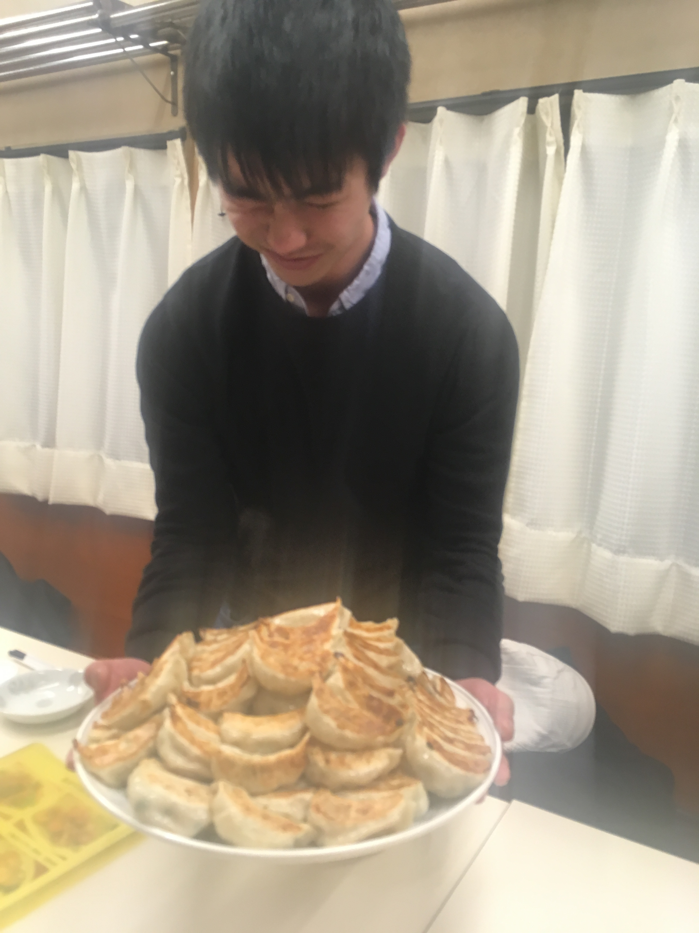 最初にジャンボ餃子に入刀(笑)した際、こんなに笑顔だった野畑くんも、