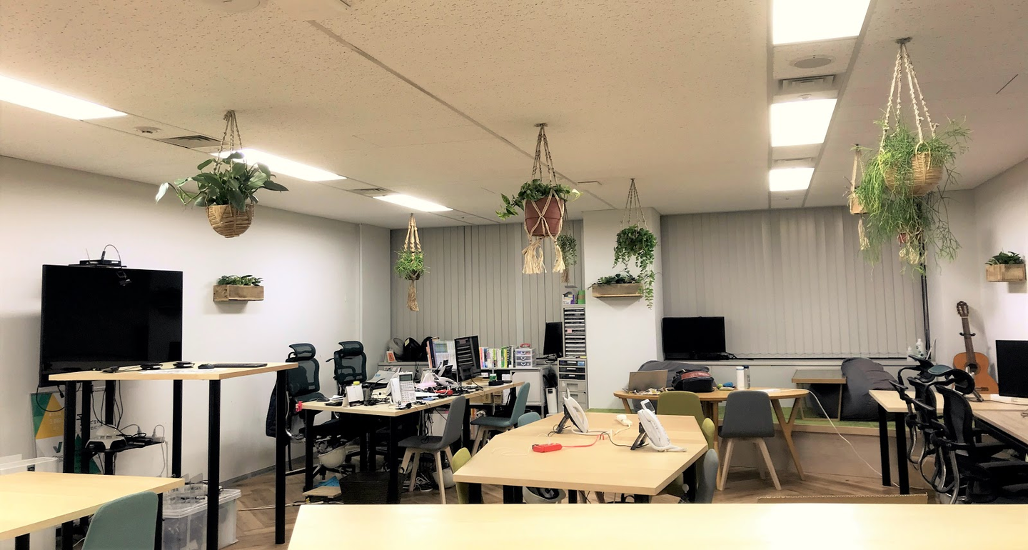2019年4月には、オフィス全体にグリーンを導入。狭小スペースなりの工夫でグリーンを吊るしたり、壁づけしました。眼と心の癒やしと加湿と空気浄化に一役買っています。