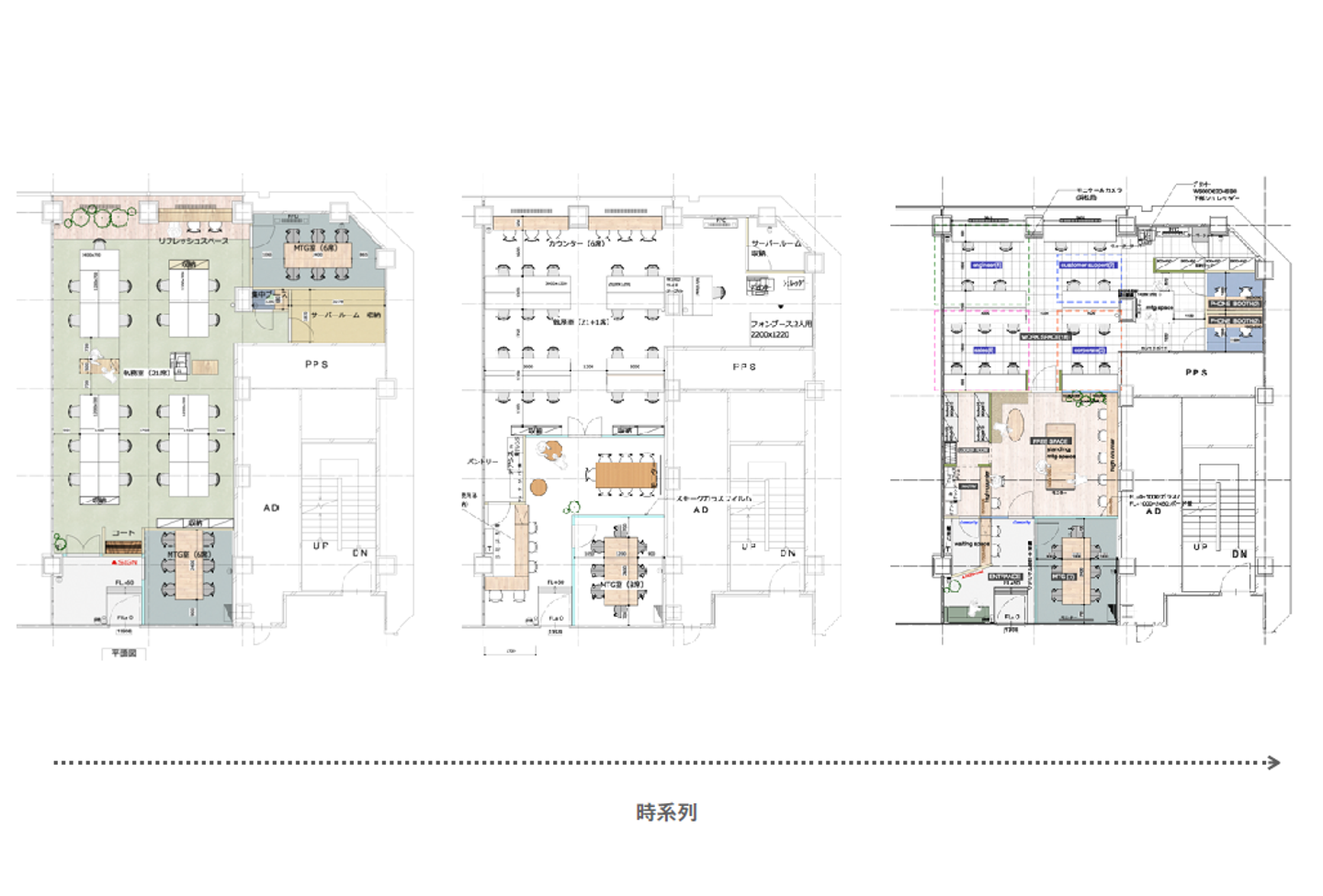 ディスカッションを重ねに重ね、平面図はどんどん変化していきました。変化を続けるイメージ図上では、希望通り、ファシリティ環境改善×コンセプトが空間に落とし込まれているように感じました。