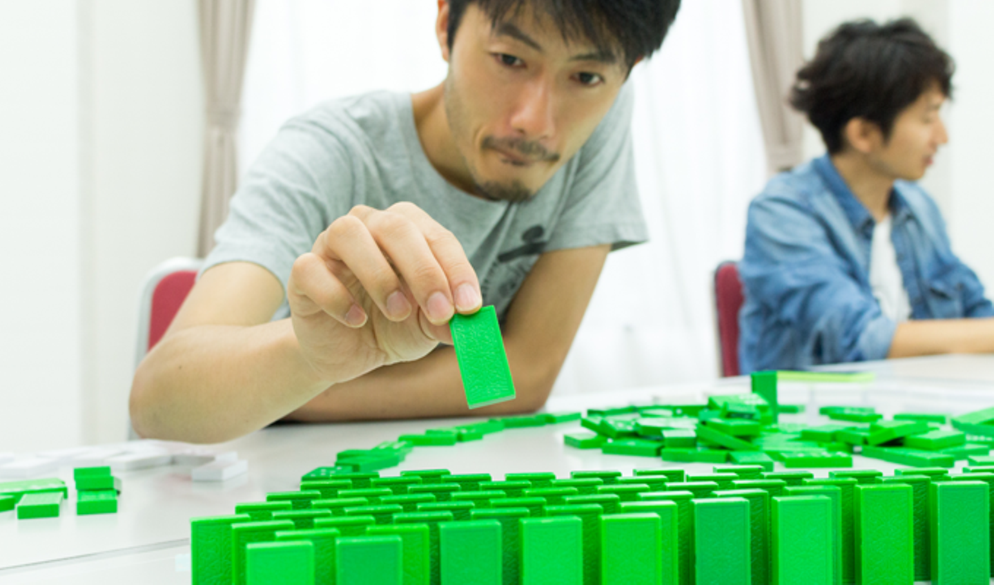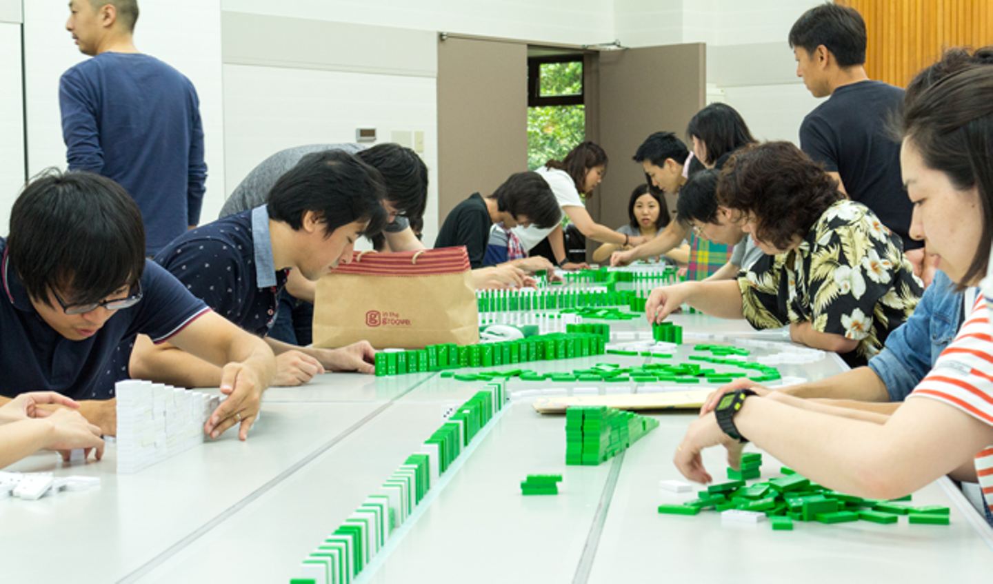 時間制限は1時間。設計図はありません、並べ方は自由。チームに分かれ完成イメージを相談しながらドミノ牌を並べていきます。