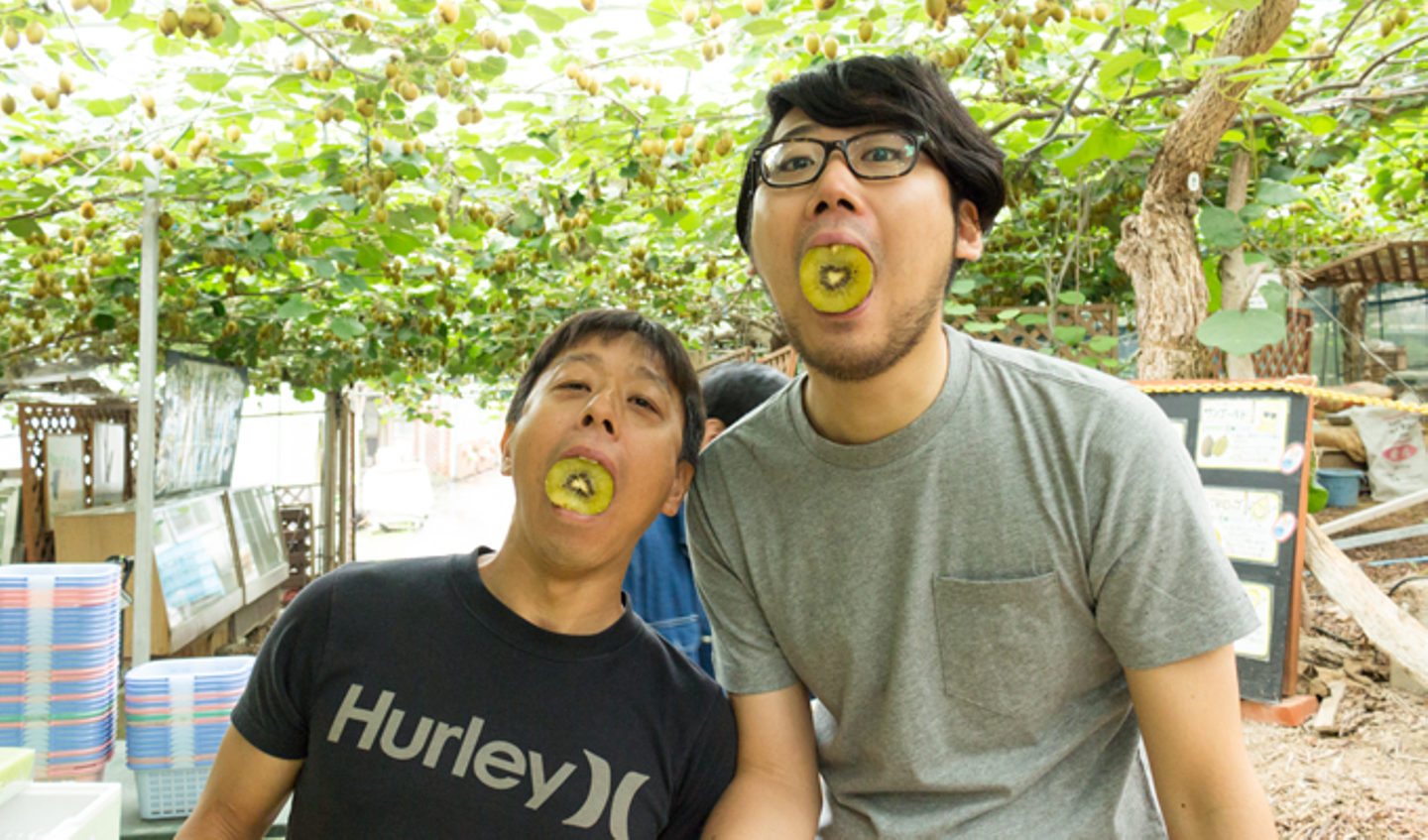 社長と並んでキウイをガブリ。園内では色んな種類のキウイが食べ放題。