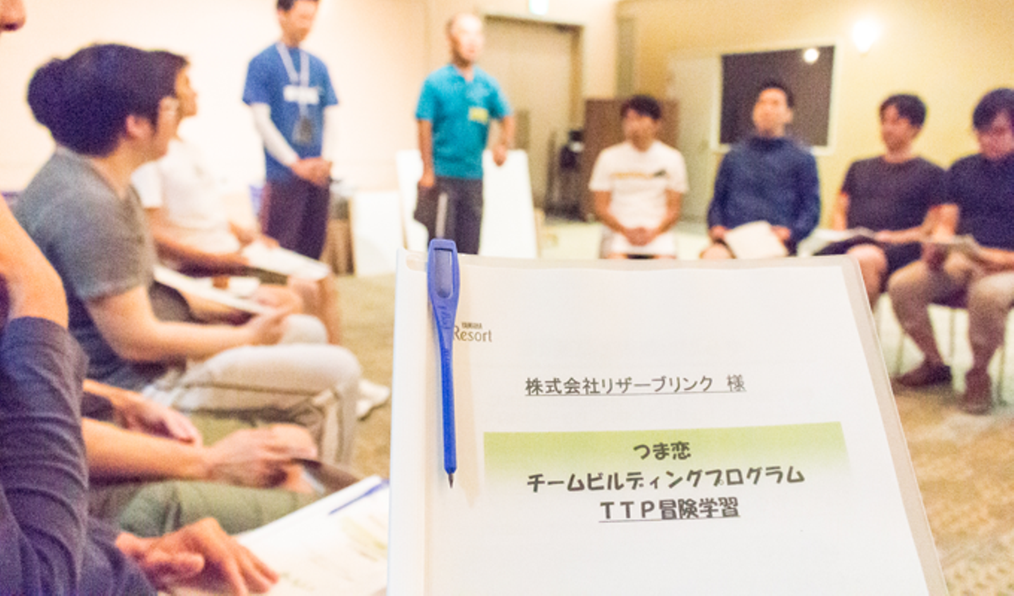 最初のアクティビティはチームビルディング研修。つま恋が提供するプログラムは身体を使いながら課題に取り組むらしい。外部のサービスを利用した全体研修は社内で初めての試みです。