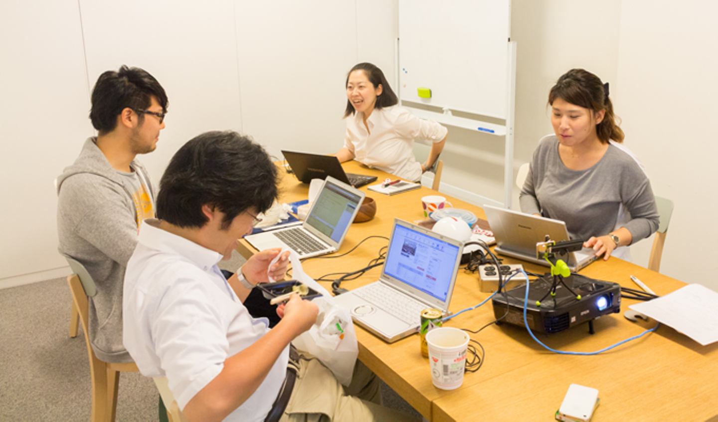 お昼の時間を活用した企画会議。部署や役職に関係なく、率直に意見を出し合います。