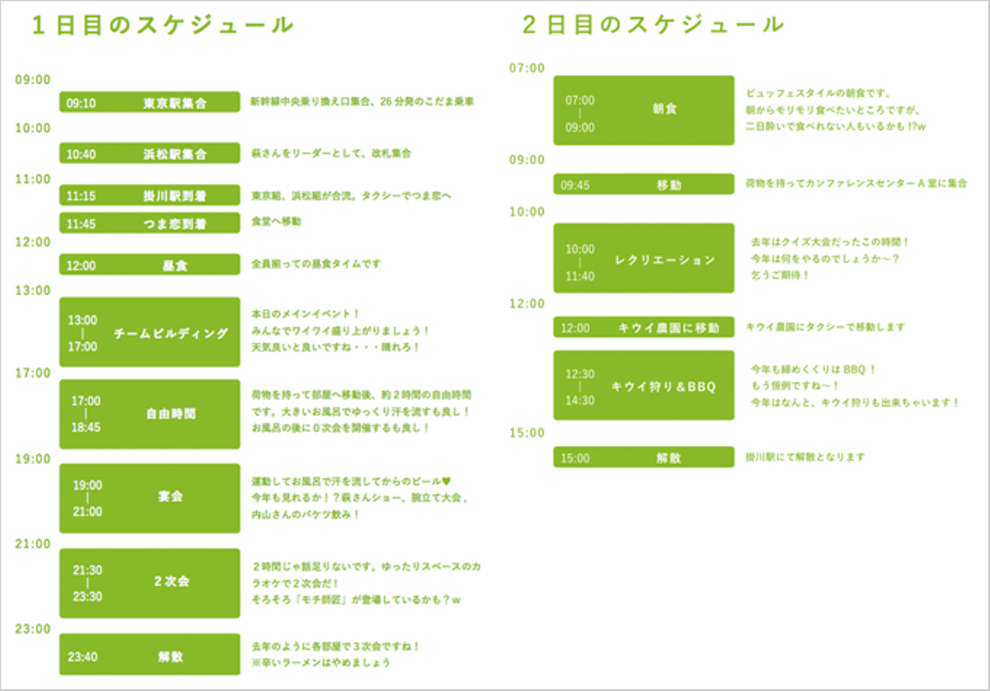社員旅行としての立てつけにこだわりすぎるとつまらなくなりますし、遊びだけにするのもなんだかもったいないよね、、というバランス感覚を保ちながらの最終スケジュールがこちらです!