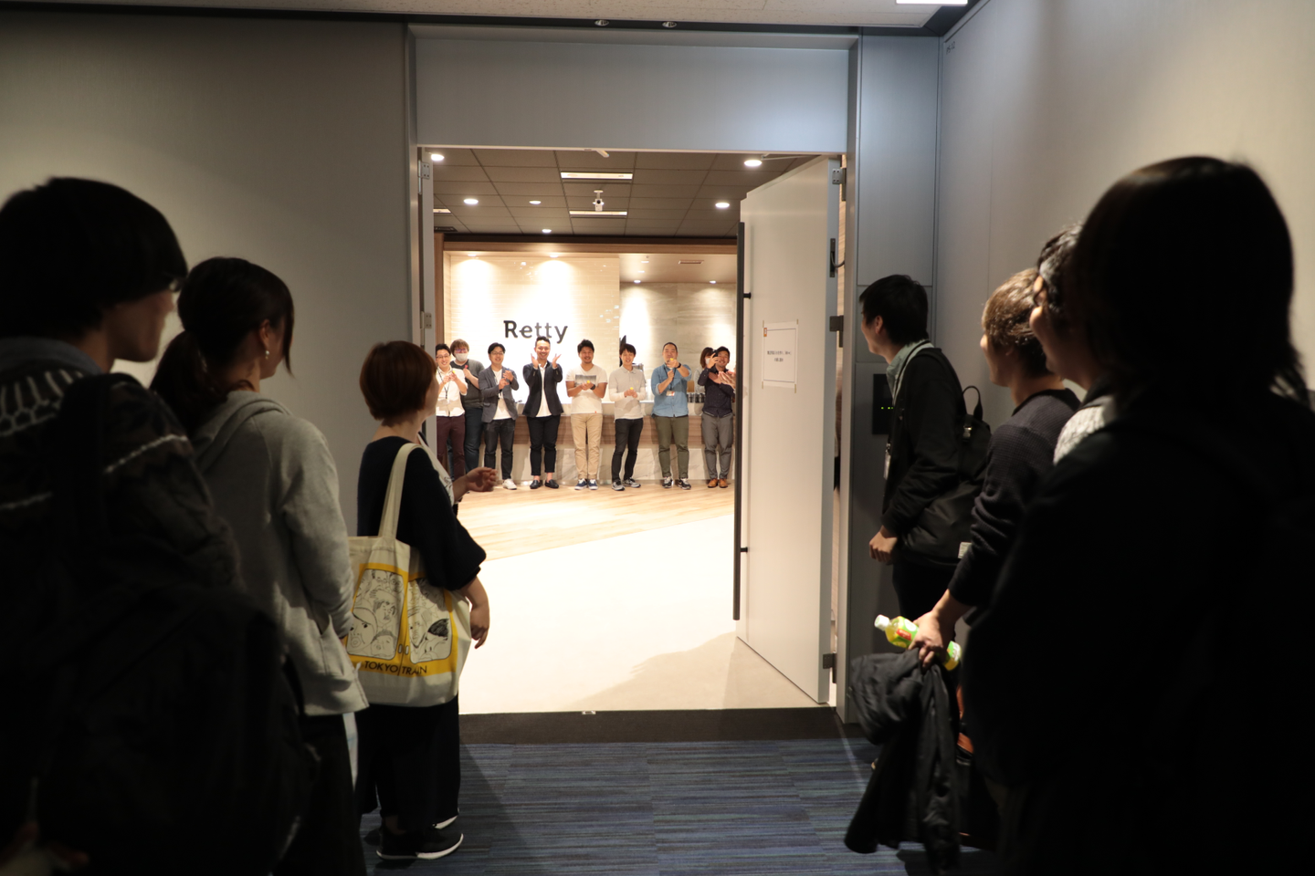 この問題の答えがRettyのビジョンである「食を通じて世界中の人々をHappyに」なっています。新卒のメンバーが声を揃えて最後の問題の答えを読み上げると、扉が開き全社員が勢揃いになり、新しいTeam Rettyのメンバーを歓迎しました。