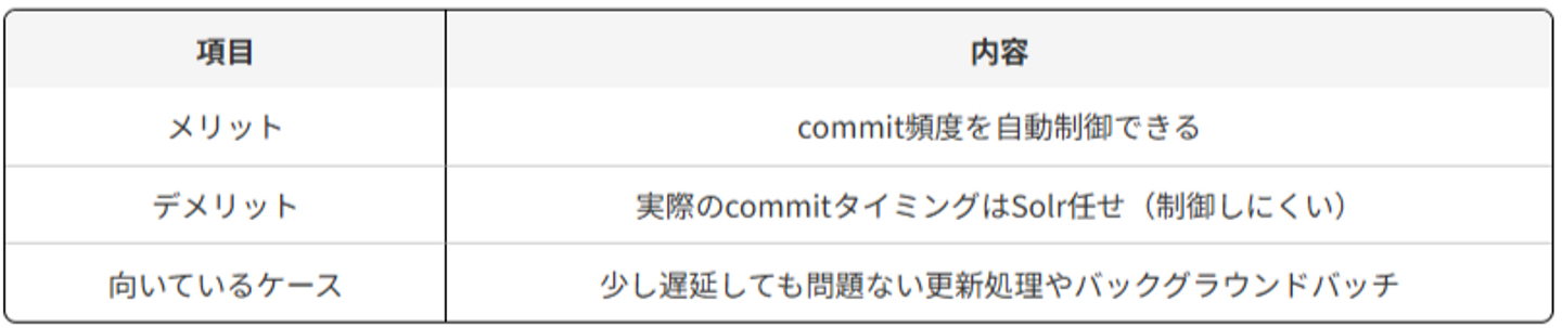 これにより、バッチ中の検索負荷を大幅に削減できます。openSearcher=falseなので、Solr上にデータは存在するが、検索は不可な状態です。Solrのdocsや各処理の整合性を確認しつつ適用しましょう。