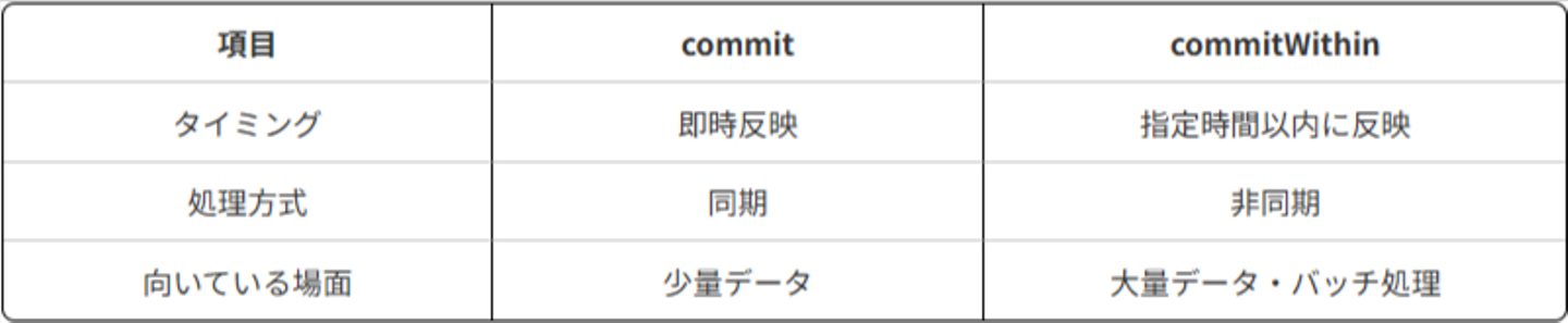 一方 commitWithinは「今すぐじゃなくていいから、◯秒以内に反映してね」とSolrに任せる命令です。
