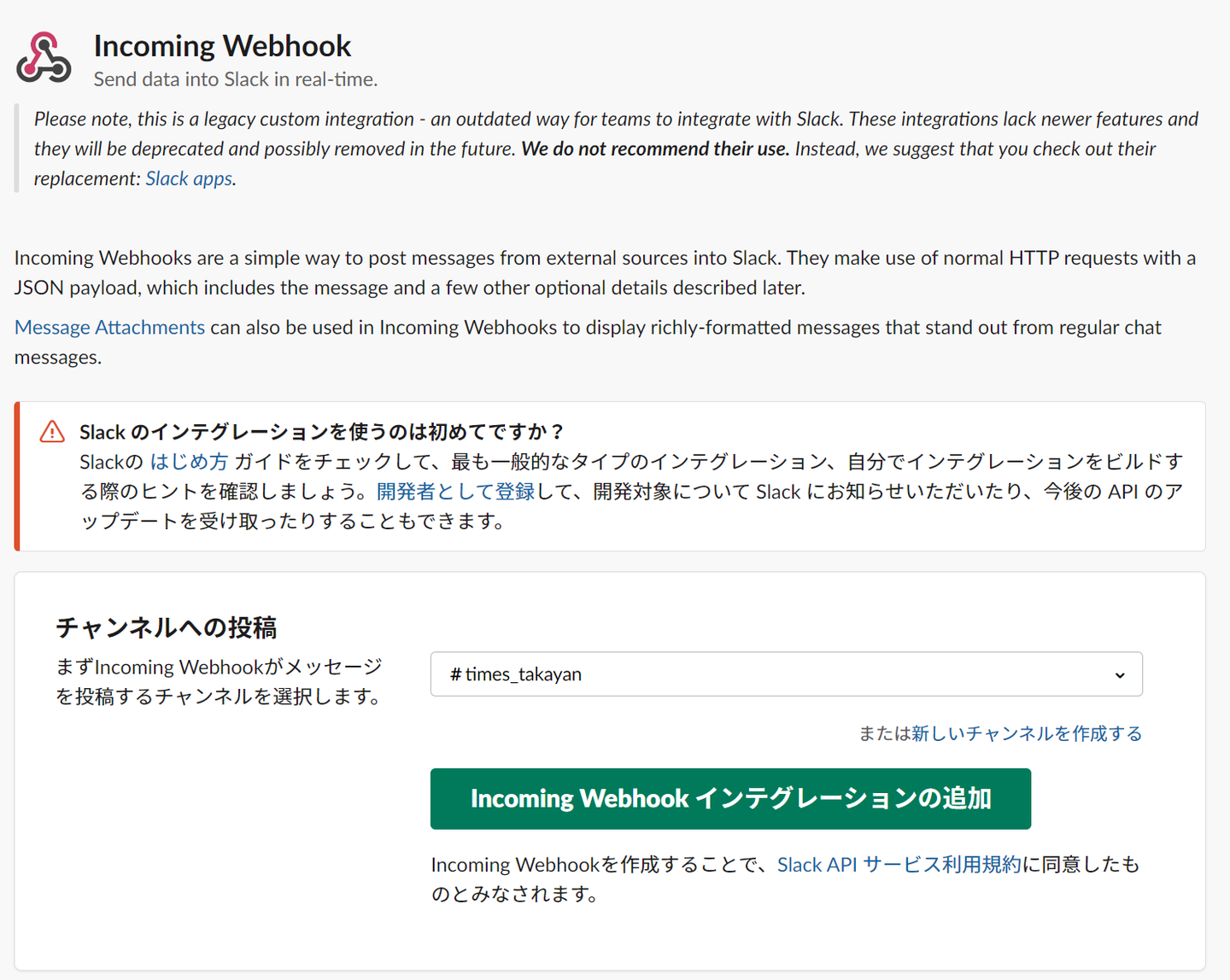 今回は私のひとりごとを発信してるチャンネルに送信できるようにしたいので、 #times_takayan を選択します!