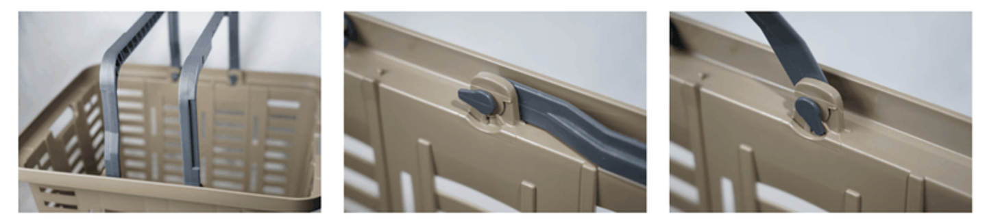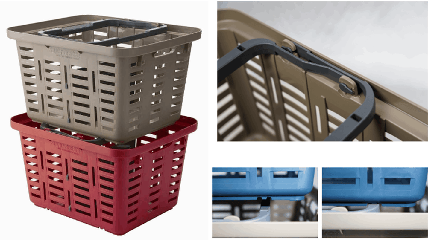いわゆる、スーパーのカゴのハンドルは左右対称です。リングスターのバスケットは特徴的でハンドルが左右非対称になっており、内側に倒す事で積み重ねが可能になっております。『当たり前の構造を少し変えてみる』このちょっとした事が、他のバスケットにはない付加価値を生み出しております。