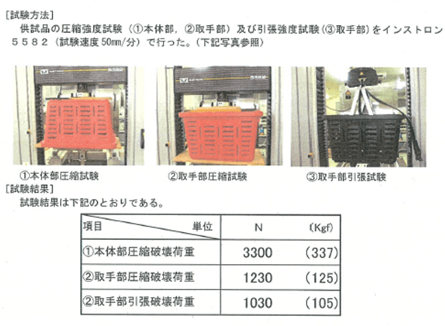 弊社では新製品発売の際に必ず耐久試験を奈良県工業技術センター様にて執り行うのですが、スーパーバスケットの試験結果がこちらになります。