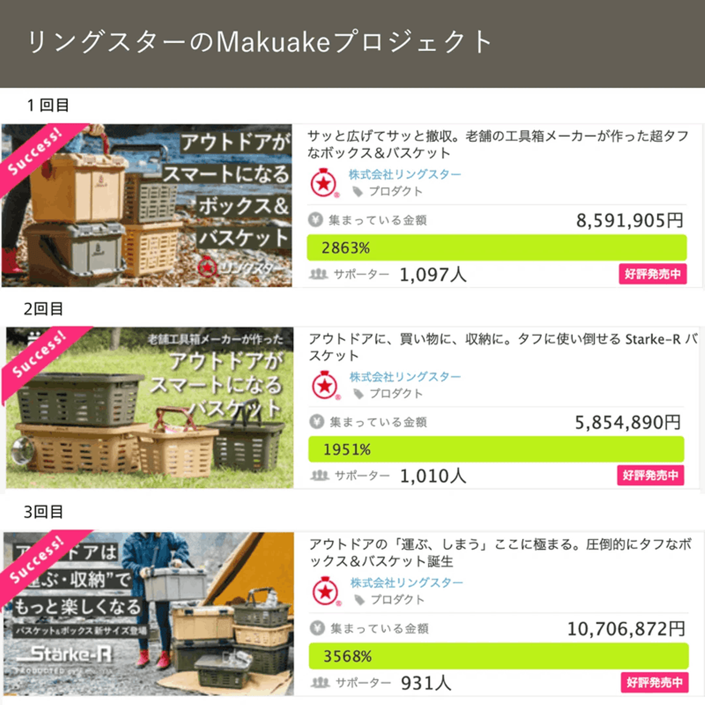 アウトドア事業のバスケットでは販売数が2023年01月現在にて、約182,000個販売しており、勢いは留まる事を知りません。
