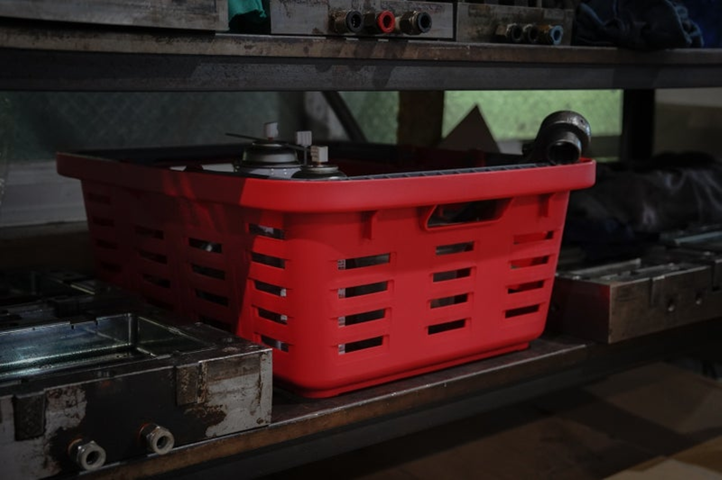 カゴの利点はその『ユーティリティさ』です。蓋を閉める手間がなく、サッと必要な工具だけを詰め込んで現場へ移動、生産性も求められる時代にとって「これこそ最適な工具箱だ」と開発を決心したそうです。スーパーのカゴは備品、だから耐久性は必要としないので、当然ですが工具を入れるとハンドルは撓りまくります。非常に危険で、落下事故や工具の破損にも繋がりますし、下の隙間から細かい物が落ちればそれこそ大事故につながる危険性もあります。※なのでリングスターのバスケットの底は網形状でない