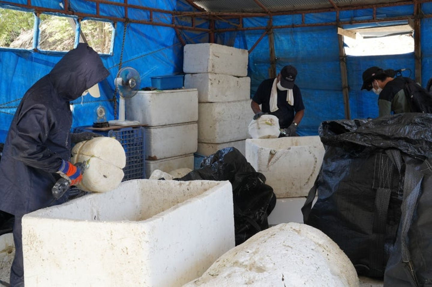 ひどいもので、流れ着いた発砲スチロールの中にかさ増しの為に異材を混入させており、分解や粉砕が困難に感じる漂着物もありました。また発泡スチロールは2%の原料を膨らませておりますので、再生という意味では非常に困難になり、労力を要する作業になります。ただ粉砕しないと容量過多にて運送及び販売もできないのです。