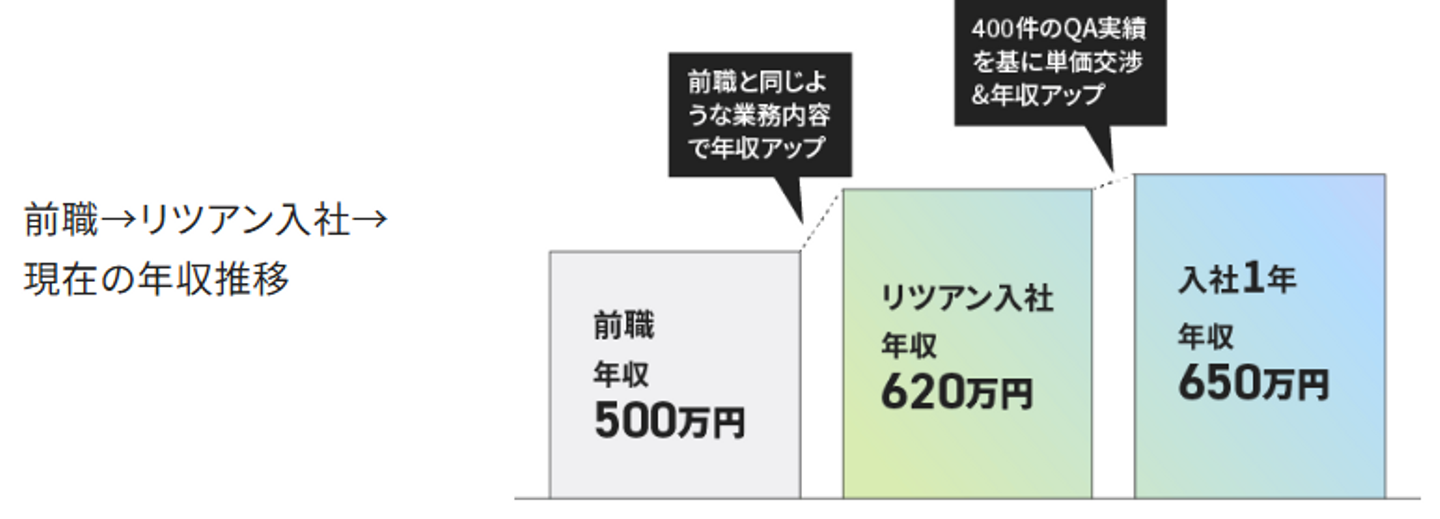 リツアンでは、毎年必ず企業へ単価交渉を行っています。単価が4万円上がると、給与還元率68%で、月給27,200円アップ=年収32万円アップ!