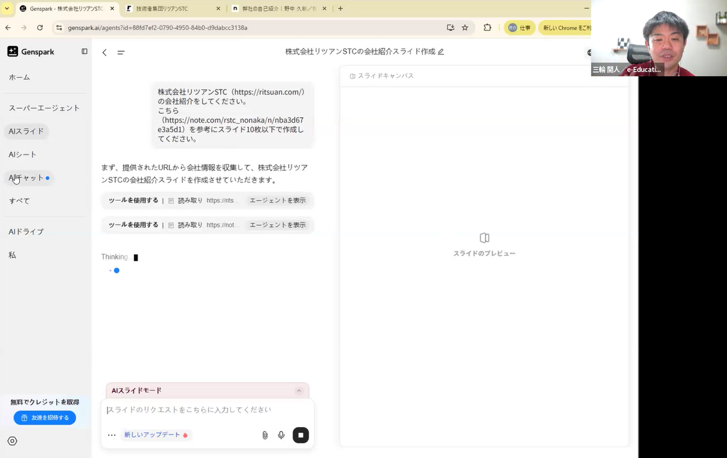 研修の後半では、生成AIを使った「実演ライブ」も展開!三輪さん自身がGensparkを活用して、以下のようなワークを披露してくださいました。