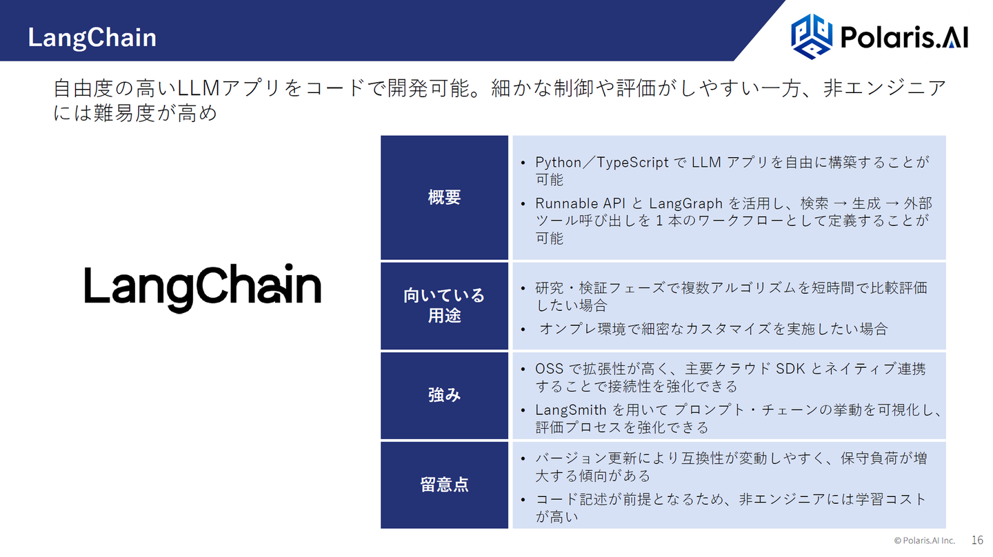 今回の講義では、まずRAGシステムに使われる主要ツールの使い分け(Dify / LangChain / Azure AI Searchなど)を紹介。その上で、RAGの構成要素を「データ」「検索」「プロンプト」「LLM」の4つの観点に分け、それぞれに対してどのような改善アプローチがあるかを解説しました。