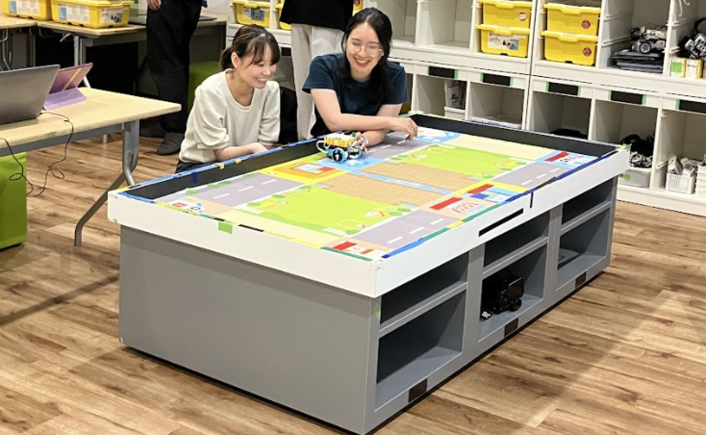 かわいいカラフルなコースで、先程作ったロボットでプログラミングを動かしてみます!
