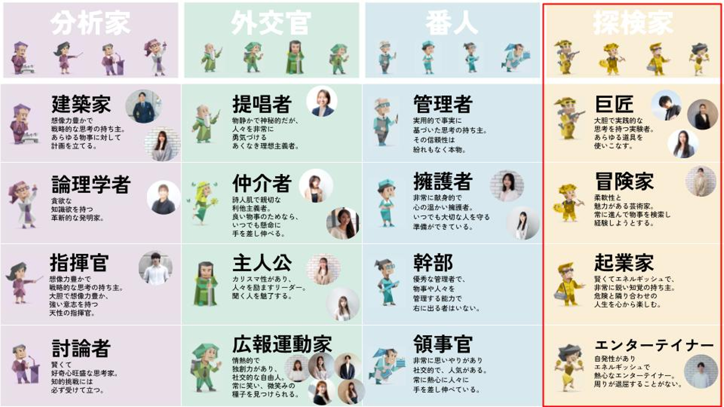 外交官タイプに次いで存在感を放っていたのが、探検家グループ(ISTP・ISFP・ESTP・ESFP)のメンバーたち。