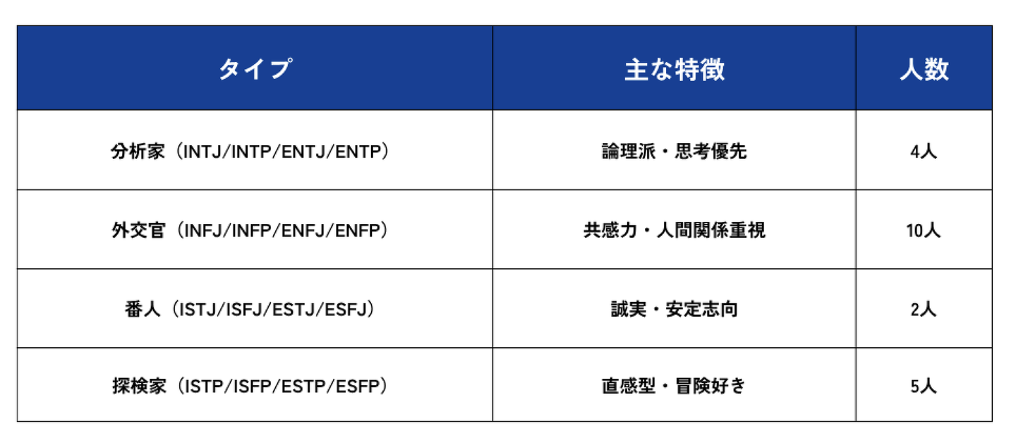 ROCメンバーのMBTI診断では、全体の半数以上となる10人が外交官タイプ(INFJ・INFP・ENFJ・ENFP)という結果に。人とのつながりを大切にし、共感と推進力をあわせ持つこのタイプが、ROCの雰囲気そのものを形づくっています!